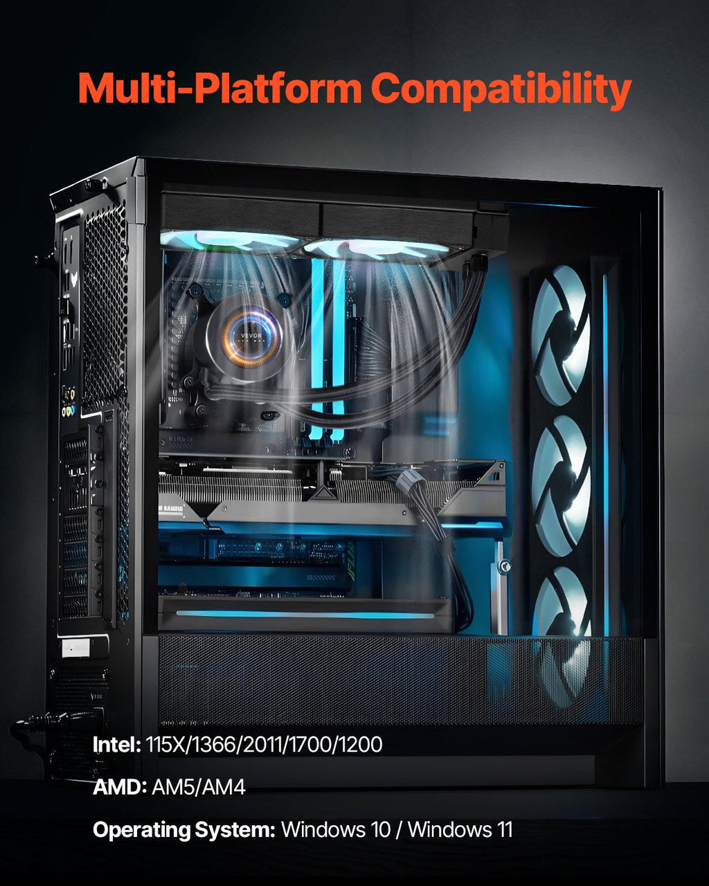 Upgrade your PC’s thermal performance with the VEVOR AIO CPU Liquid Cooler, designed for both Intel and AMD systems. This all-in-one cooler features a sleek ARGB lighting system and three powerful 120mm PWM fans that balance strong airflow with low noise. The aluminum heat sink, reinforced cooling tubes, and quality ABS+PC build ensure long-lasting durability and efficient heat dissipation. Ideal for gamers, creators, and performance users, this cooler keeps your CPU running at optimal temperatures under pressure.