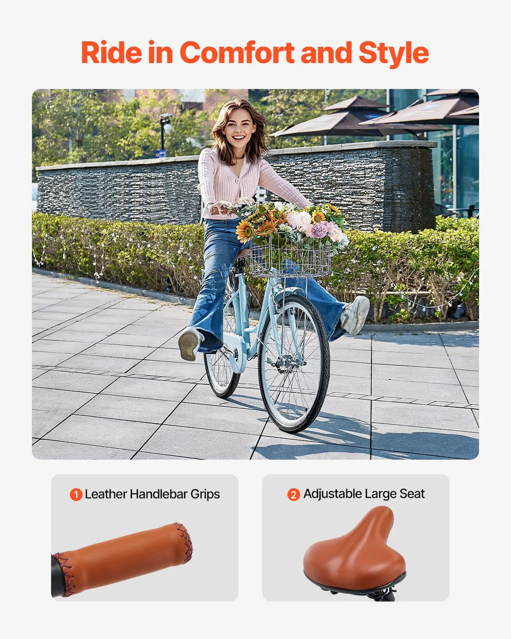 Stylish & Comfortable: Features a wide, soft adjustable seat and ergonomic handlebars for an upright riding posture. Ideal for casual cruising, beach rides, city sightseeing, and short commutes. Suitable for wearing dresses, jeans, or casual outfits while riding.