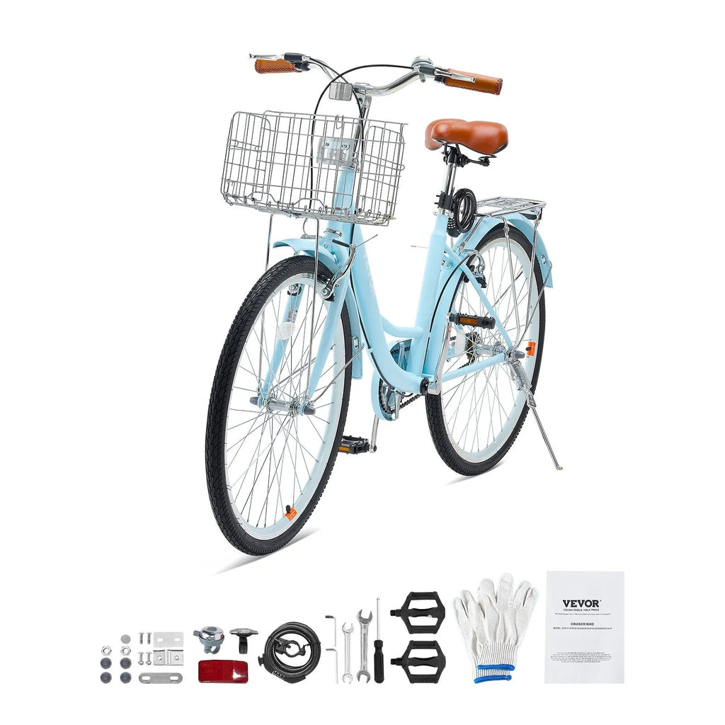 Enjoy leisurely rides with the VEVOR Cruiser Bike, a stylish and comfortable 26-inch beach cruiser designed for casual cycling, exercise, and daily errands. With a spacious front basket, rear rack, and ergonomic design, this bike combines practicality, durability, and ease of use for riders of all levels.