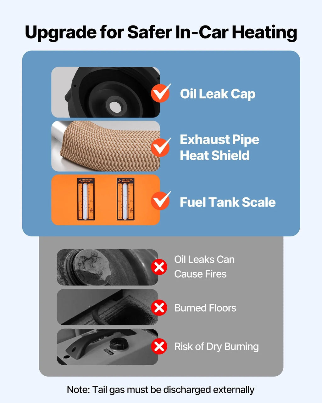 Upgraded Security Features: Heat-insulated exhaust pipe shield prevents burns or scorching. Leak-proof fuel cap reduces risks on rough roads. Fuel gauge ensures timely refueling and avoids dry burning.