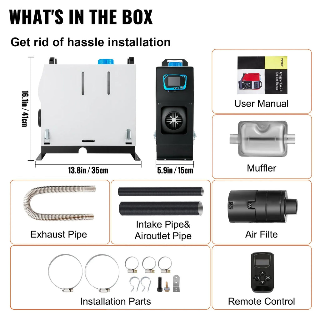 Experience efficient, low-noise heating with the VEVOR 8KW Diesel Air Heater All-in-1, designed for trucks, vans, RVs, campers, boats, and other diesel vehicles. Its sandblasted aluminum combustion chamber, base, and heat-dissipating fins provide uniform heat and rapid warming. Featuring advanced intelligent sensors, this heater prevents dry operation while delivering low emissions, low fuel consumption, and long-running reliability.