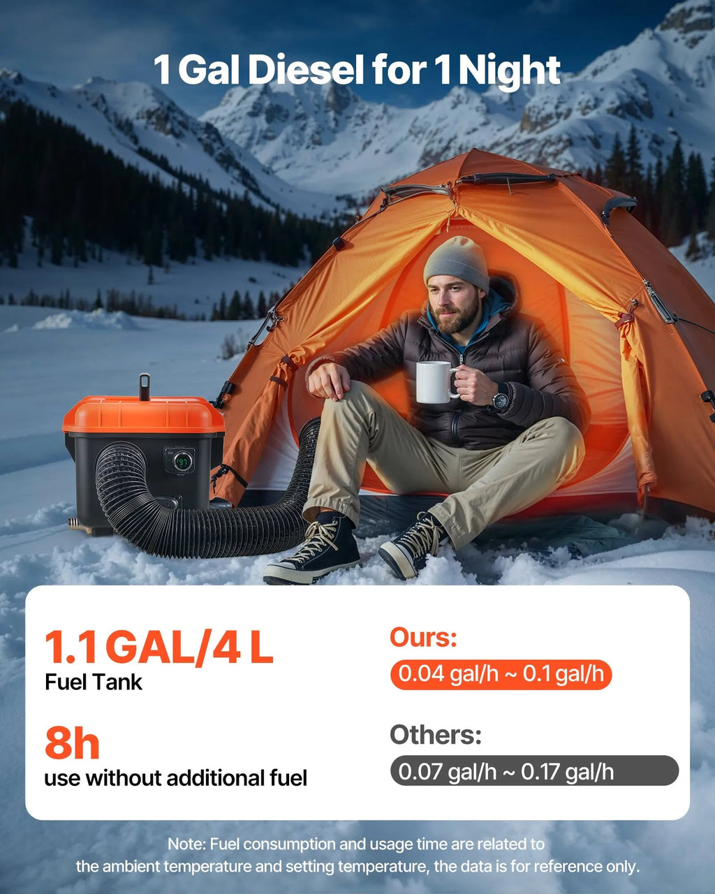 Equipped with an energy-efficient fuel pump, over 90% combustion efficiency, and a 1.1-gallon fuel tank, this diesel heater provides long-lasting warmth with minimal fuel consumption. Safety features include CO alarm, exhaust pipe heat sleeve, sealed fuel cap, overheat shutoff, reverse polarity, and overvoltage protection. The LCD panel and remote control (up to 98 ft) allow easy temperature adjustment from 46.4–96.8°F (8–36°C), providing comfort and convenience in any environment.