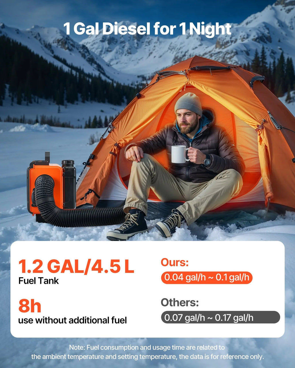 Equipped with a quiet, energy-saving fuel pump and a 1.2-gallon fuel tank, this heater provides long-lasting heat with over 90% combustion efficiency. Safety features include CO alarm, exhaust pipe heat sleeve, sealed fuel cap, overheat shutoff, reverse polarity, and overvoltage protection. Easily control temperature from 46.4–96.8°F (8–36°C) via the LCD screen or remote up to 98 ft away, ensuring comfort and convenience wherever you are.