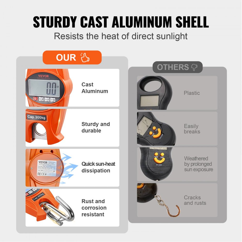 The VEVOR Digital Crane Scale is a rugged, handheld hanging scale designed for precise weighing in tough environments. Built with a cast aluminum case and equipped with an easy-to-read LCD screen, this scale delivers accurate measurements up to 660 lbs (300 kg) with a precision of 0.1 lb (0.05 kg). Its compact size and lightweight design make it ideal for farm, hunting, fishing, outdoor, and garage use. Choose from pounds, kilograms, or newtons for versatile applications, all backed by reliable construction and simple operation.