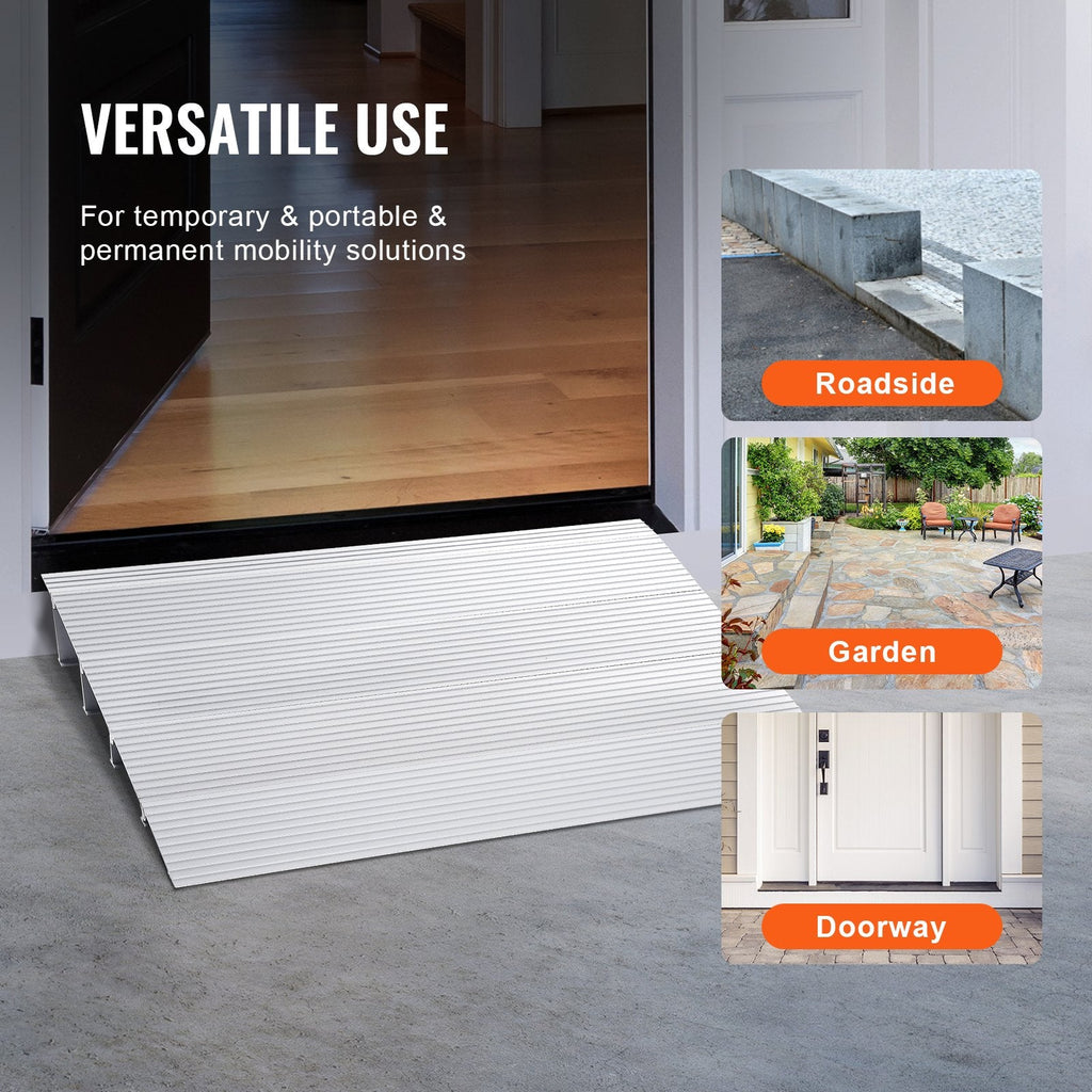 The VEVOR Door Threshold Ramp with a 4-inch rise provides a sturdy, dependable solution for overcoming higher door thresholds. Built from durable aluminum alloy, this ramp supports up to 800 lbs (362.8 kg), ensuring safe and easy access for wheelchairs, scooters, and power chairs. Its modular design allows for flexible assembly and adjustment to perfectly fit your doorway needs. Ideal for both indoor and outdoor use, the ramp features a non-slip surface for maximum safety and secure footing. Lightweight yet strong, it’s a practical upgrade to enhance accessibility and convenience.