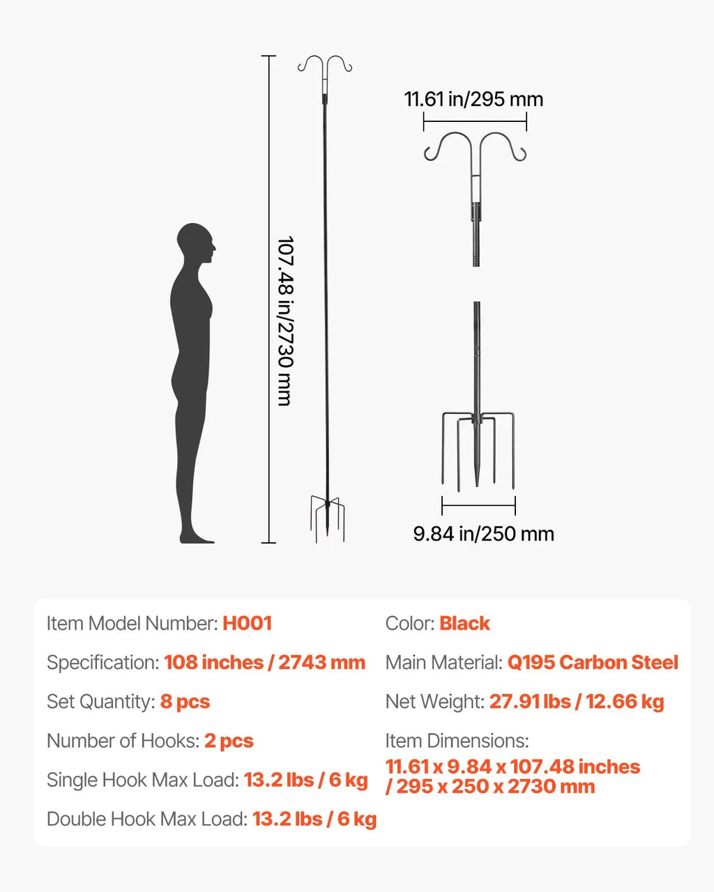Enhance your backyard bird-watching experience with the VEVOR Double Shepherds Hook 8 Pack. Crafted from high-quality, rust-resistant steel, these 108-inch poles provide sturdy support for bird feeders, hanging plants, or lanterns. Each pole features a double hook design, allowing multiple items to be hung securely. With easy installation and adjustable height, this set is perfect for gardens, patios, or outdoor spaces, combining functionality with durability.