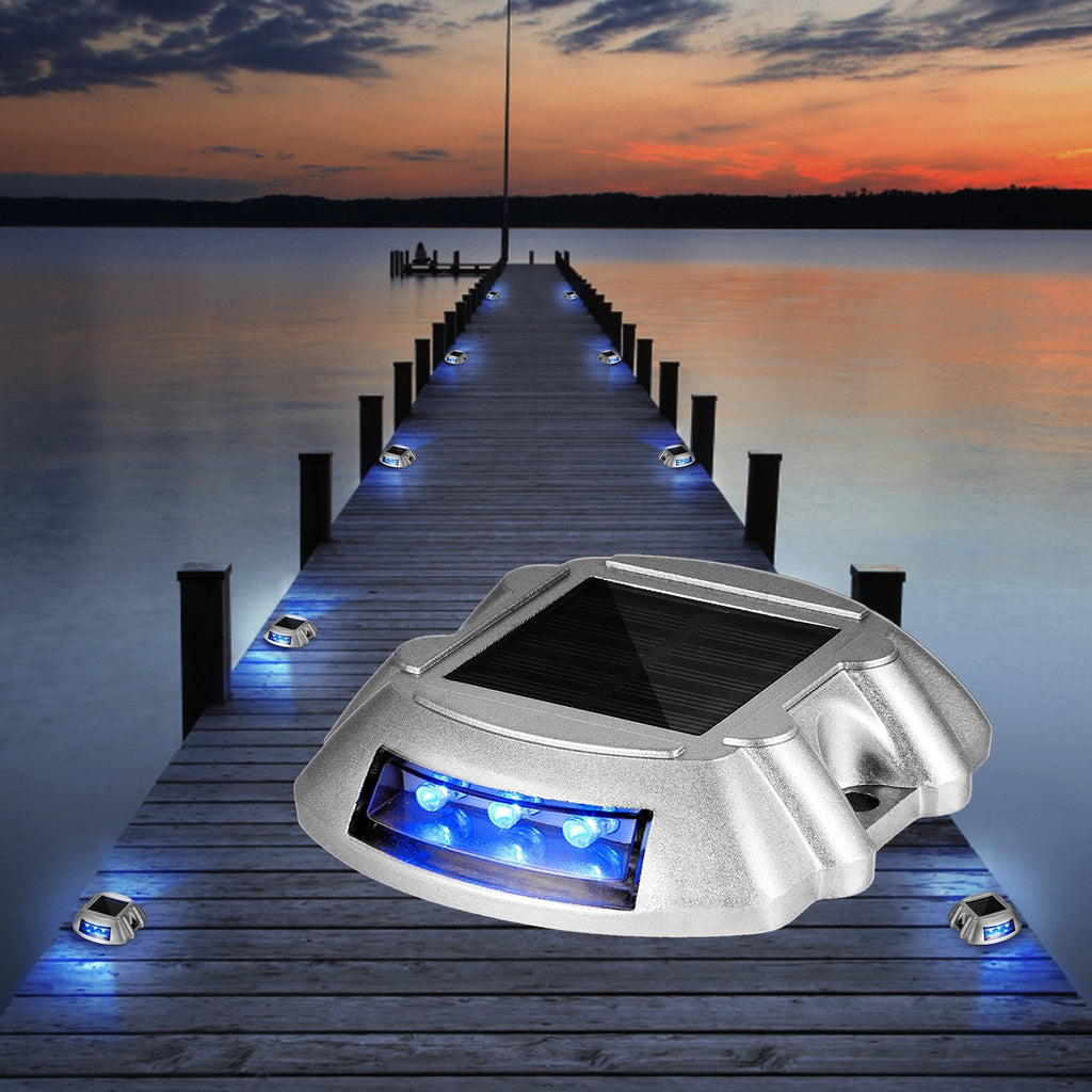 The VEVOR Driveway Lights 4-Pack features bright blue solar-powered LED lights designed for outdoor use. Made from durable die-cast aluminum, these waterproof, wireless dock lights include 6 bright blue LEDs each to illuminate pathways, gardens, driveways, sidewalks, and steps with vibrant color. Equipped with an easy-to-use switch button and simple installation, they operate on a mono-crystalline solar panel with a rechargeable Ni-MH battery, delivering long-lasting performance even in harsh weather.