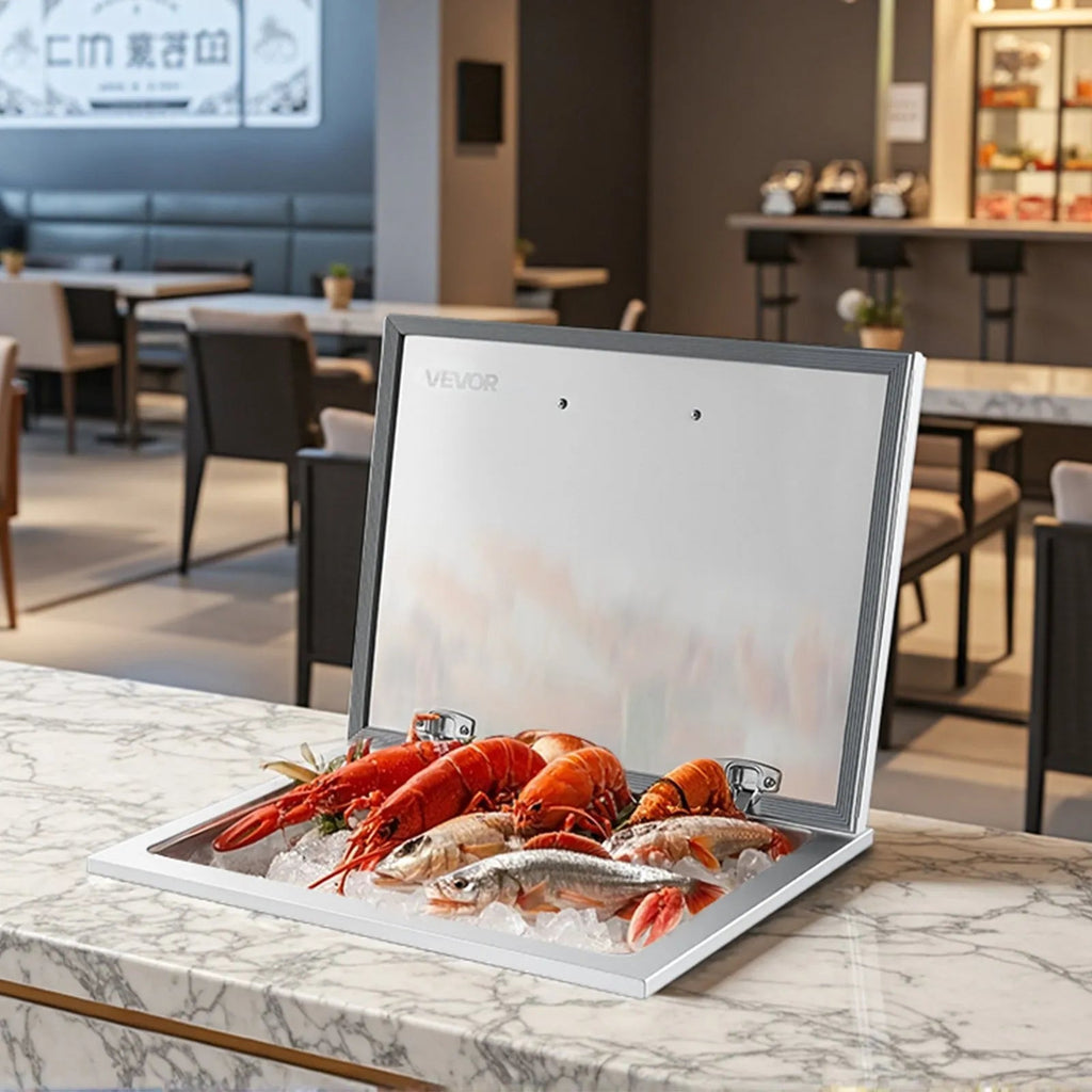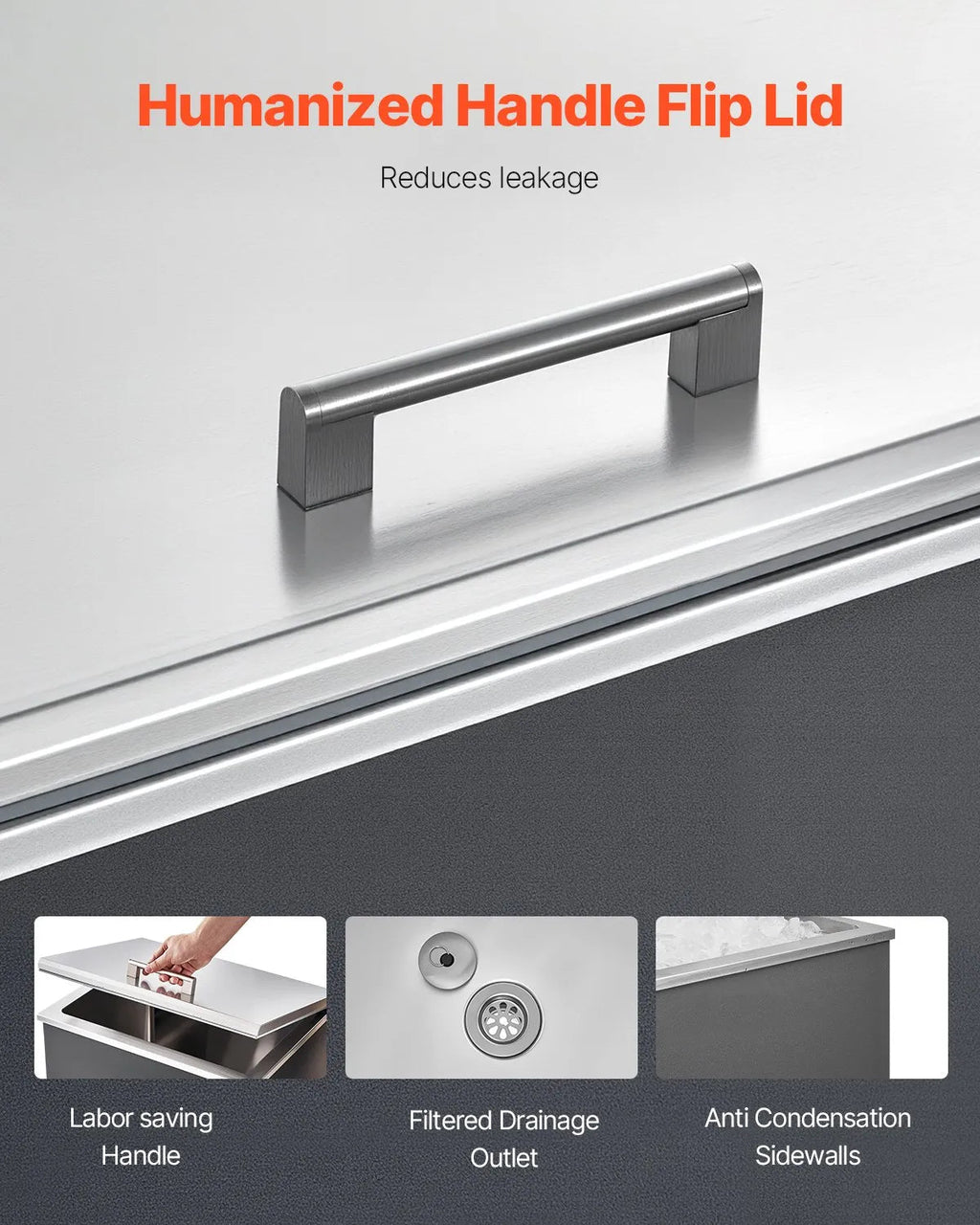 Make your outdoor entertaining, bartending, and beverage cooling effortless with the VEVOR Drop-In Ice Chest, a high-capacity stainless steel ice bin designed for patio bars, outdoor kitchens, restaurants, and beverage counters. With a generous 113.7-quart capacity, triple-layer insulation, and a durable flip lid, this ice cooler keeps drinks cold for over 24 hours without electricity. Built with a fully welded interior, drainage system, and space-saving drop-in installation, it’s the perfect solution for storing ice, chilled beverages, fruits, seafood, and more.