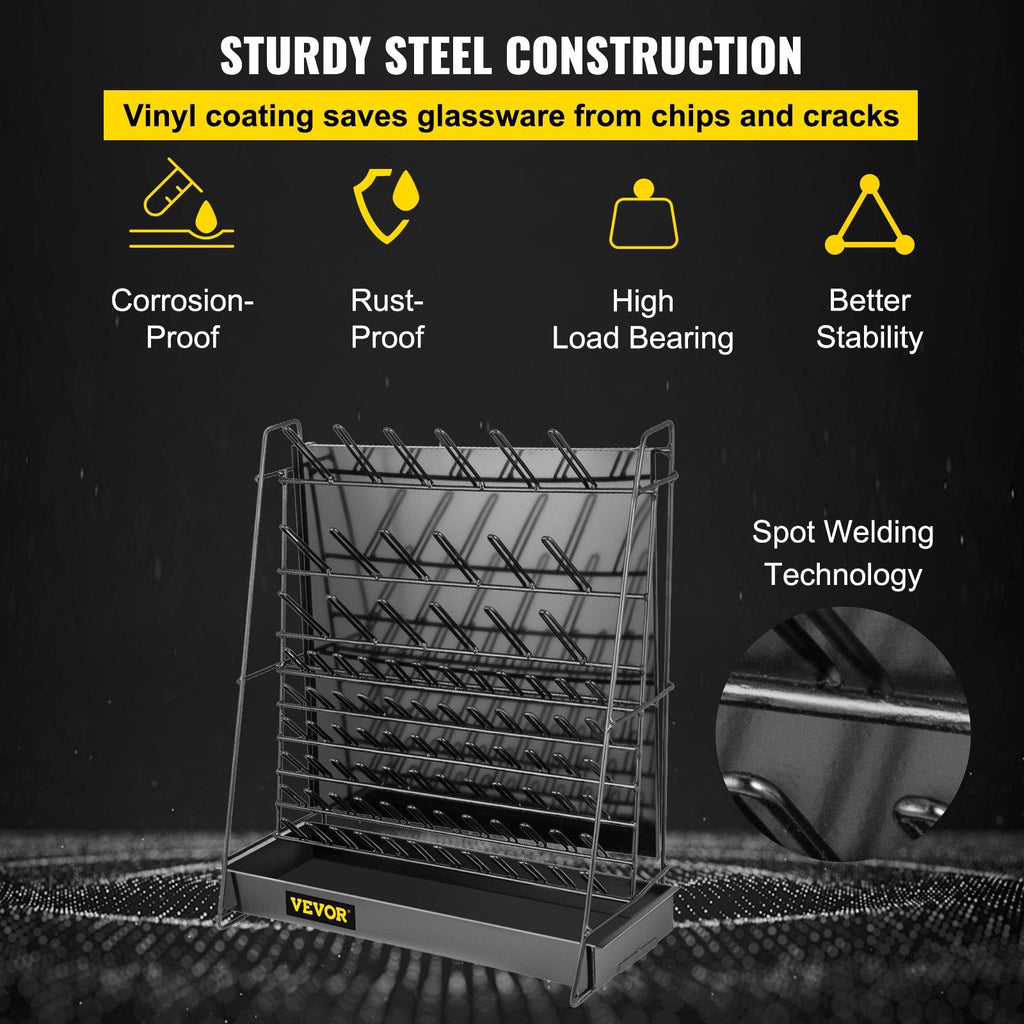 The VEVOR Drying Rack for Lab is a high-capacity, durable solution designed for drying laboratory glassware efficiently. With 90 sturdy steel wire pegs, this rack supports a large number of items, making it ideal for high-traffic lab environments. It offers dual mounting options—wall-mounted or free-standing—for flexible placement. The detachable pegs and black cleaning frame ensure easy maintenance and a sanitary setup for both school and professional laboratories.