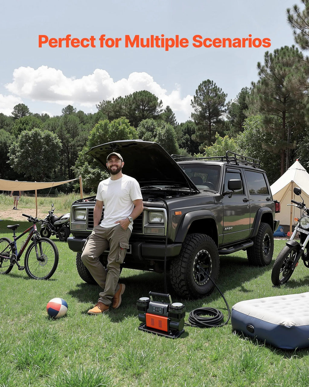 Ultra-Fast Inflation: Dual-cylinder design delivers 10.6 CFM airflow and 150 PSI working pressure, inflating tires up to 2× faster than standard compressors.