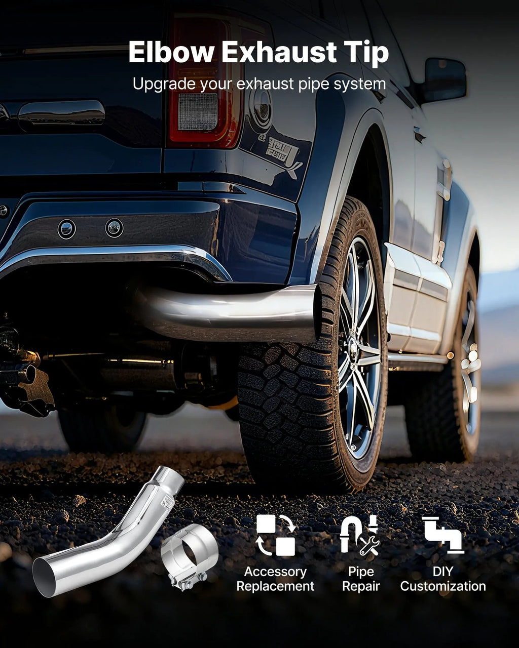 The VEVOR 4" Inlet / 5" Outlet Elbow Exhaust Tip is a durable and stylish upgrade for trucks, sedans, SUVs, and sports cars. Featuring a chrome finish, reinforced construction, and easy installation with included clamp, it enhances exhaust flow, sound, and overall performance while providing long-lasting resistance to heat, corrosion, and wear.