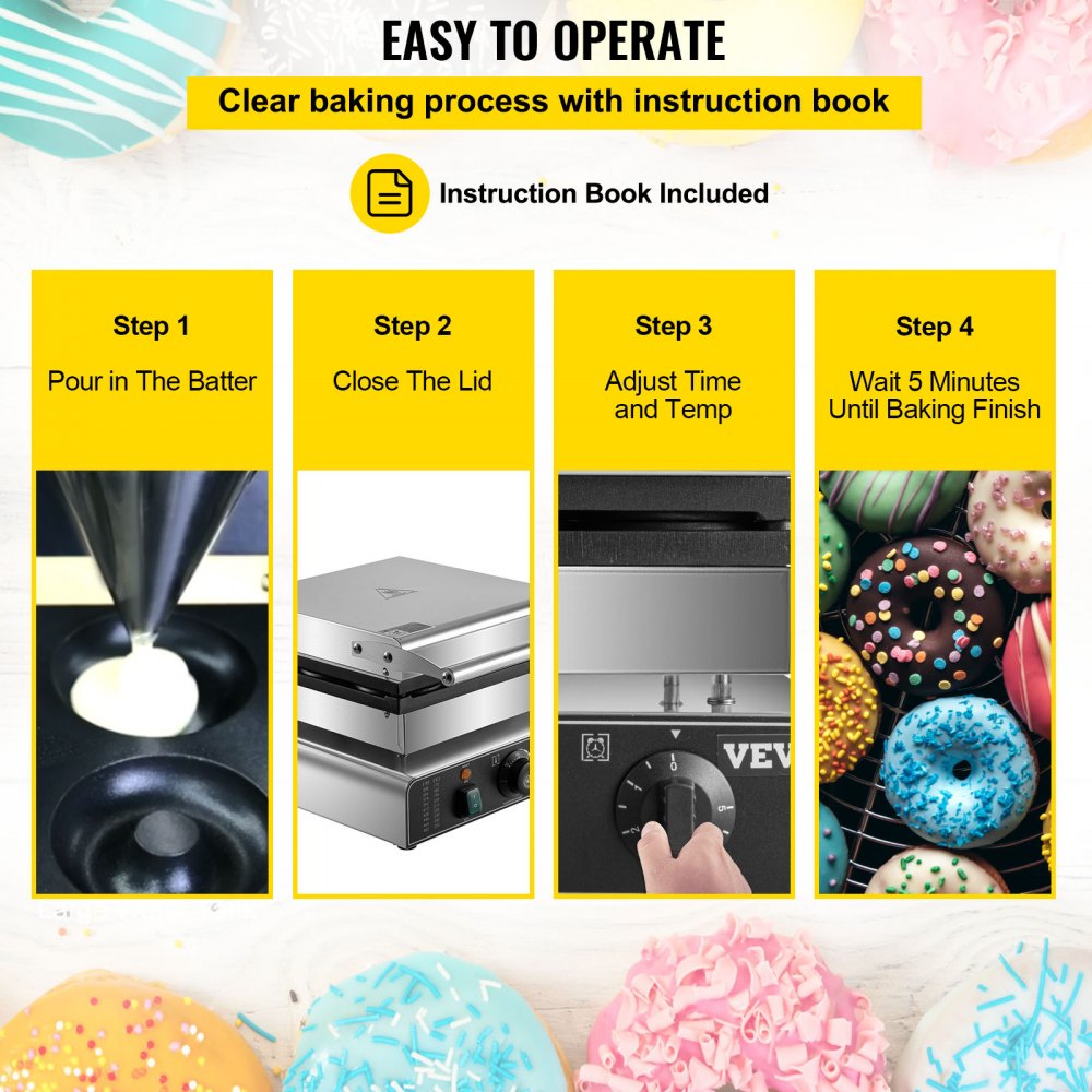 The VEVOR Electric Donut Maker is a commercial-grade machine built for fast and uniform donut production. Featuring 9 holes and a powerful 2000W heating element, it provides efficient double-sided heating for consistent, golden-brown results. The non-stick Teflon coating ensures easy donut release and hassle-free cleanup, while the heavy-duty construction supports both home and commercial use. Whether in a bakery, café, food truck, or home kitchen, this donut maker combines performance, ease of use, and reliability in one compact unit.