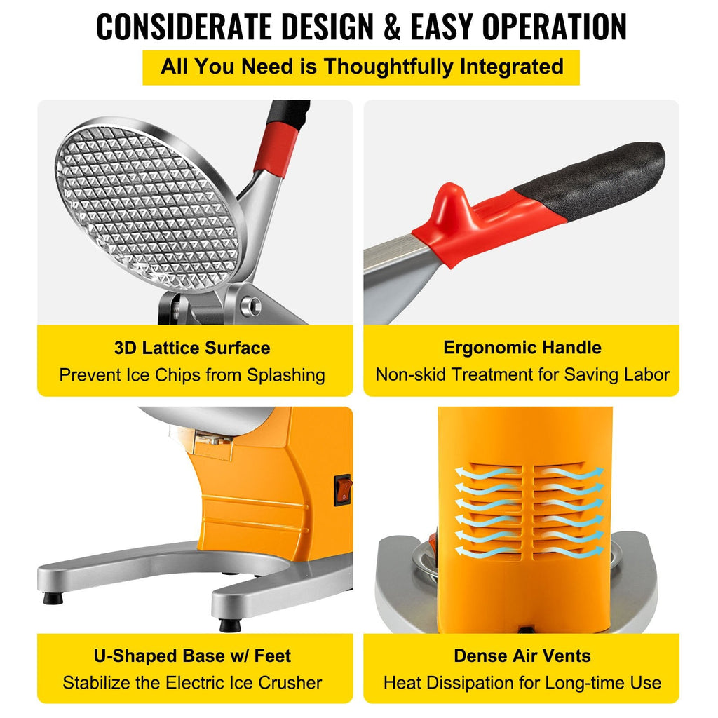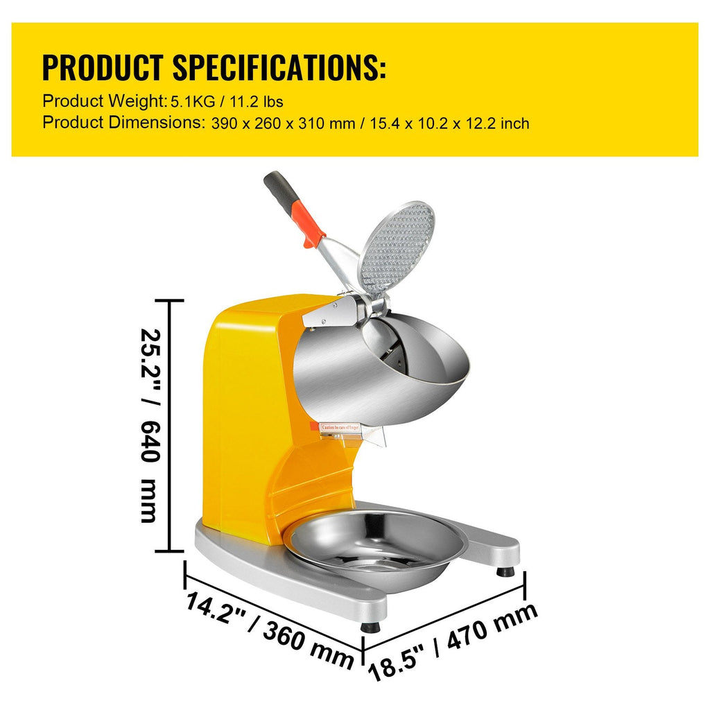 The VEVOR Electric Ice Shaver Crusher is a powerful and efficient snow cone maker machine, designed for both home and commercial use. With dual stainless steel blades and a 300W copper motor, this machine can produce up to 210 lbs (95 kg) of shaved ice per hour. It features an extra-large ice bowl and an ice inlet diameter of 4.5 inches, making it ideal for high-demand environments. The user-friendly design ensures easy operation, while the 1450 RPM rotating speed delivers fast and consistent results. Perfect for making snow cones, shaved ice, and other frozen treats.