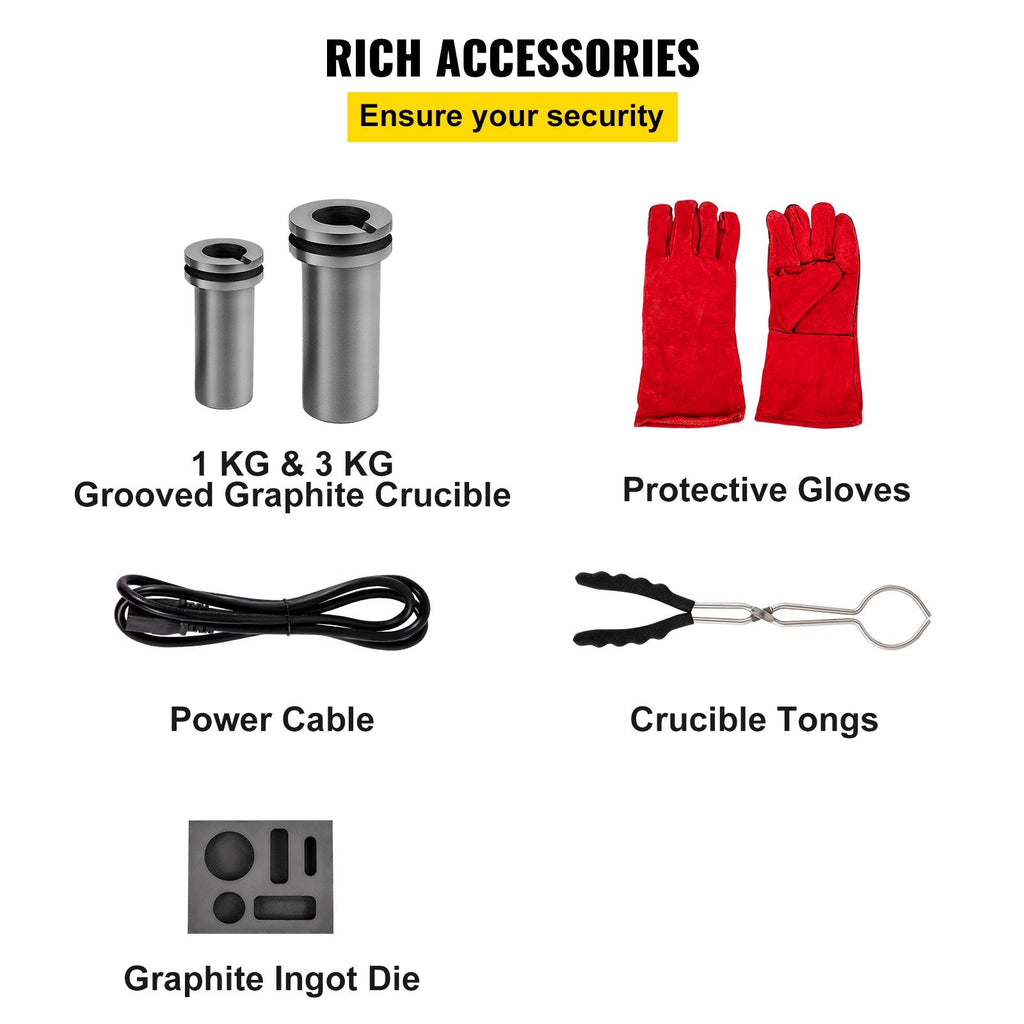 Included Items: 1KG Graphite Crucible, 3KG Graphite Crucible, Ingot Die