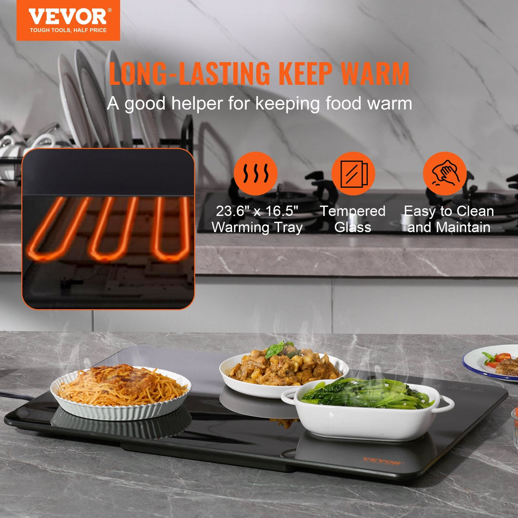 The VEVOR Electric Warming Tray is the perfect addition to your dining or entertaining setup. With a spacious 23.6" x 16.5" tempered glass surface, this tray provides fast, even heating to keep multiple dishes warm at once. Adjustable temperature control (65–90°C) ensures ideal serving conditions for various meals, whether you're hosting a dinner, catering event, or holiday party. Built with durable microcrystalline glass, this warming tray is both easy to clean and elegant enough for any occasion.