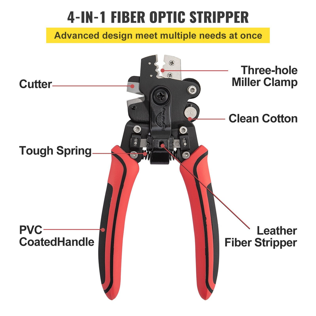 The VEVOR Fiber Optic Stripper is a multifunctional 4-in-1 tool designed for professionals and DIYers involved in electrical work and fiber optic maintenance. This versatile tool features a three-hole fiber stripper for precise stripping, a built-in wire cutter for efficient trimming, and a soft cleaning cotton for keeping fiber ends clean. The ergonomic handle with spring action ensures comfort and control during extended use. Compact and lightweight, this tool is essential for accurate, clean, and safe fiber optic cable handling.