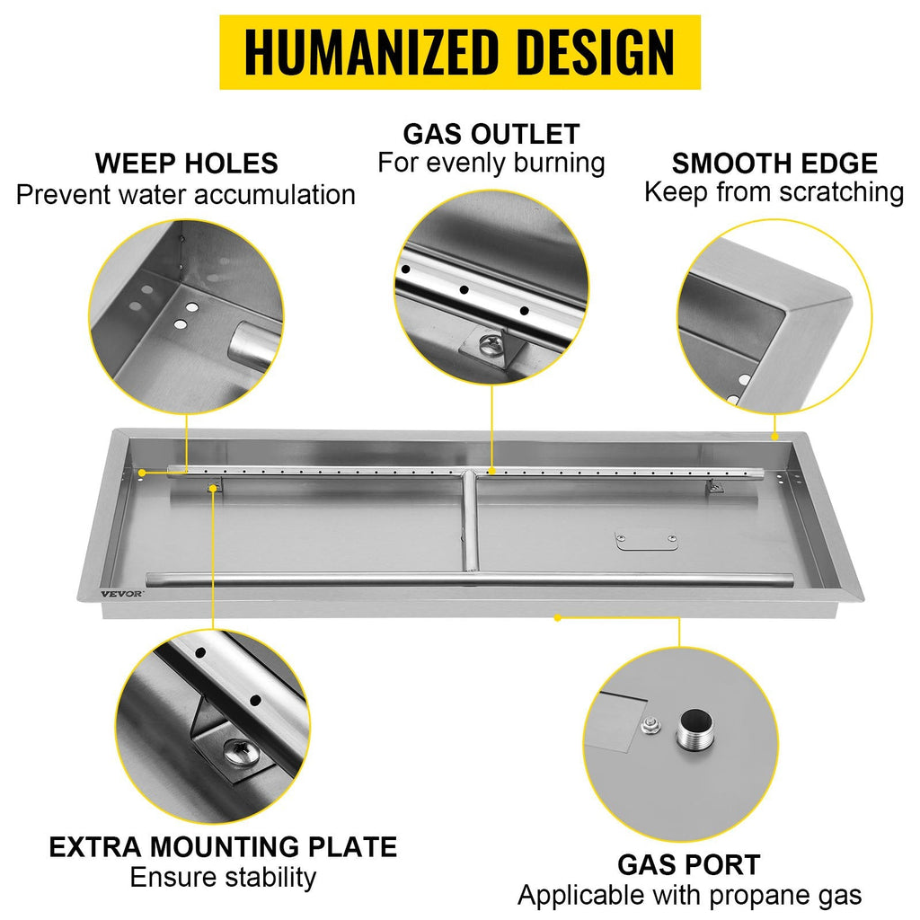 The VEVOR Fire Pit Pan is a 31.5 x 12-inch rectangular stainless steel fire pit pan featuring a built-in H-burner with a powerful 90,000 BTU output. Crafted from durable stainless steel, it ensures long-lasting performance and resistance to heat and weather. Designed for propane and natural gas use, this fire pit pan offers simple installation and requires less fire glass for a clean, efficient flame. Its considerate design makes it suitable for a variety of outdoor fire pit setups.