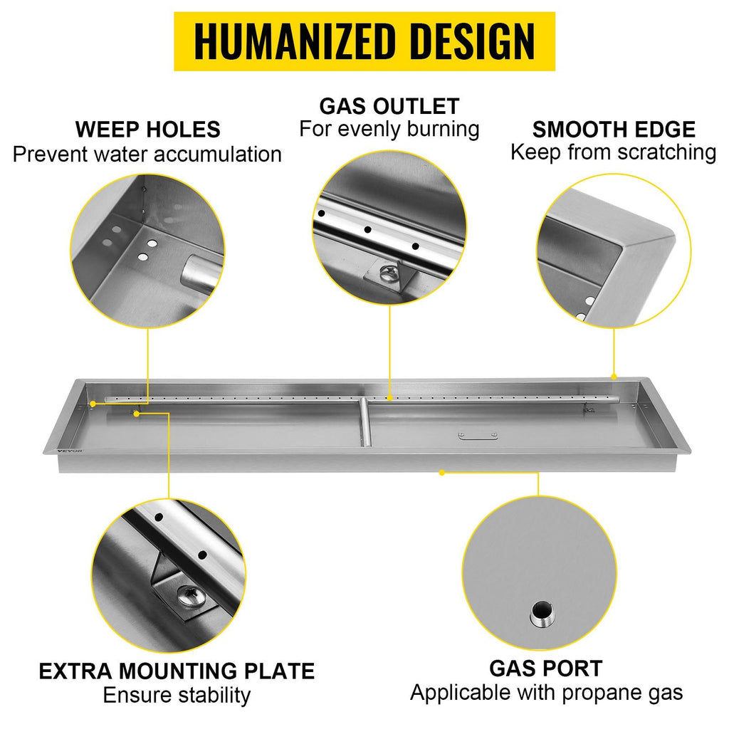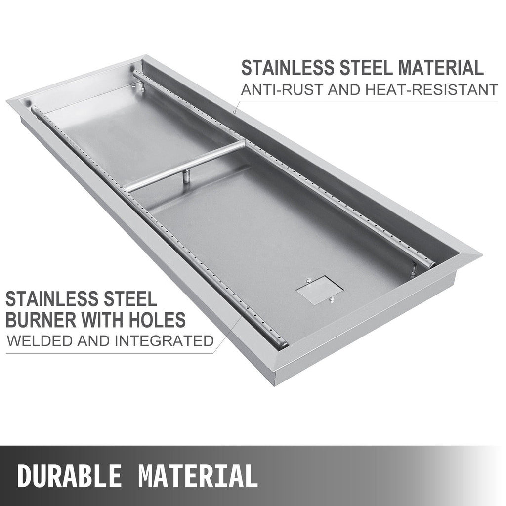 Elevate your outdoor ambiance with the VEVOR Stainless Steel Linear Fire Pit Pan, designed for clean, efficient, and visually striking flames. Measuring 49" x 16", this durable trough-style pan is crafted from premium stainless steel, offering excellent heat resistance and long-lasting performance in all weather conditions. Compatible with both propane and natural gas, it features a built-in burner for effortless integration into custom fire pit setups.Engineered for reduced fire glass usage and easy installation, this drop-in burner pan provides uniform flame distribution and adds a modern touch to patios, backyards, or commercial outdoor spaces. Whether you're building a new fire feature or upgrading an existing one, VEVOR delivers professional-grade performance with thoughtful design.