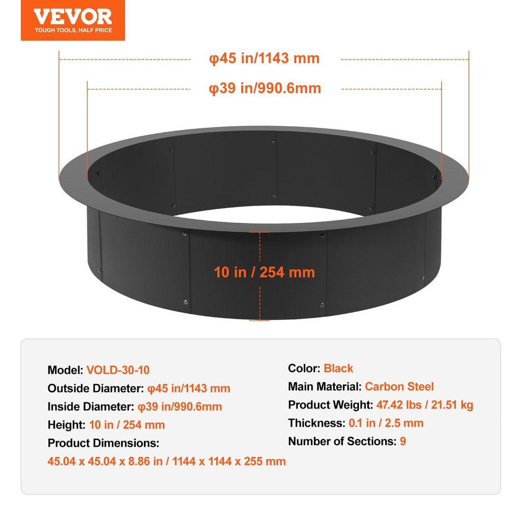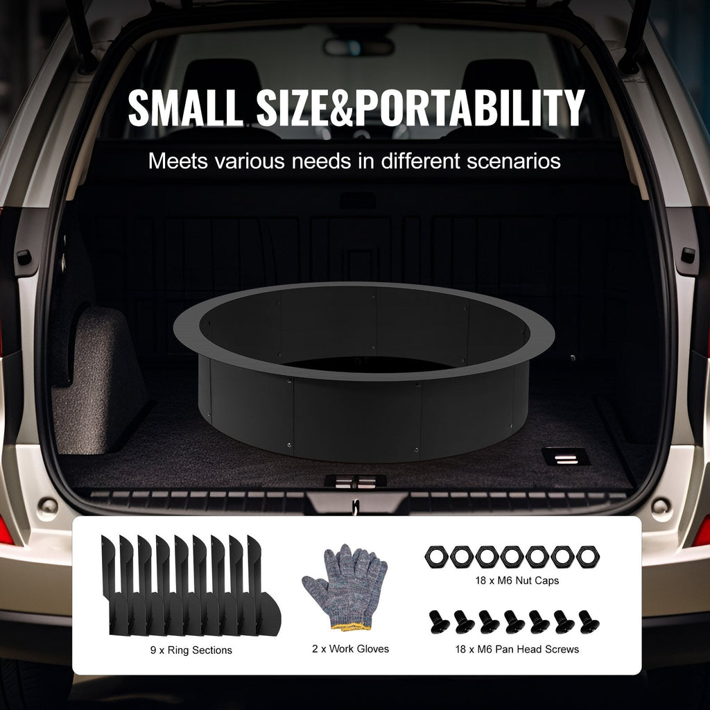 Enhance your outdoor space with the VEVOR 44" Fire Pit Ring, designed for those who enjoy both DIY projects and outdoor relaxation. Crafted from durable Q235 carbon steel with a high-temperature coating, this fire pit liner provides superior heat resistance and longevity. Its ample internal space and 9 interlocking sections make assembly easy and provide flexibility in design. Whether you're looking to create a cozy campfire or a larger gathering space, this fire pit ring is perfect for backyard patios, gardens, or campsites.