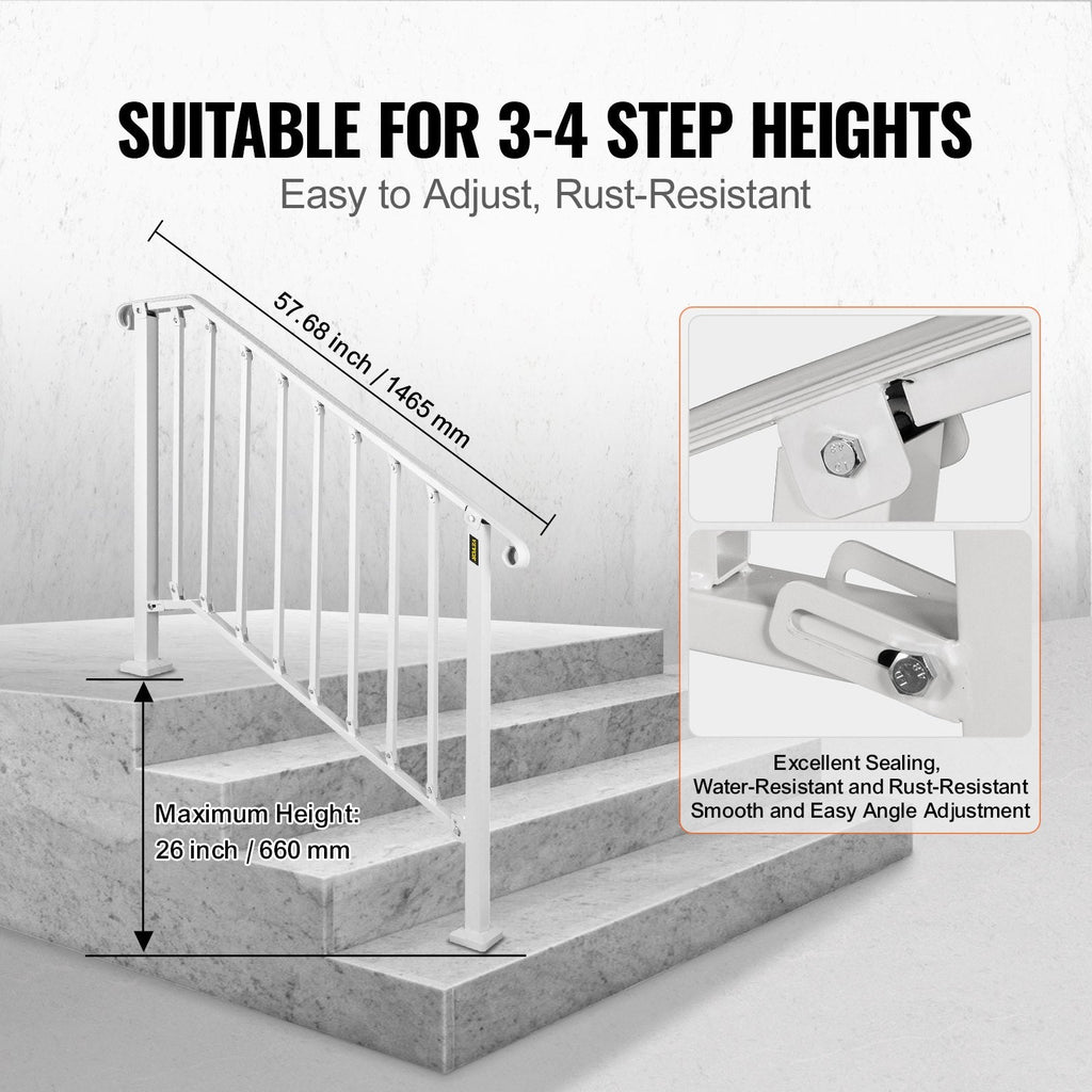 The VEVOR Fit 3 or 4 Steps Outdoor Stair Railing offers a stylish and functional solution for enhancing safety and curb appeal. Crafted from durable wrought iron and finished in a crisp white color, this railing features the elegant Picket#3 design, blending classic charm with modern durability. Suitable for both concrete steps and wooden stairs, it’s a versatile addition to porches, patios, and entryways. The flexible design ensures a secure fit for a variety of step configurations, making it ideal for residential use.