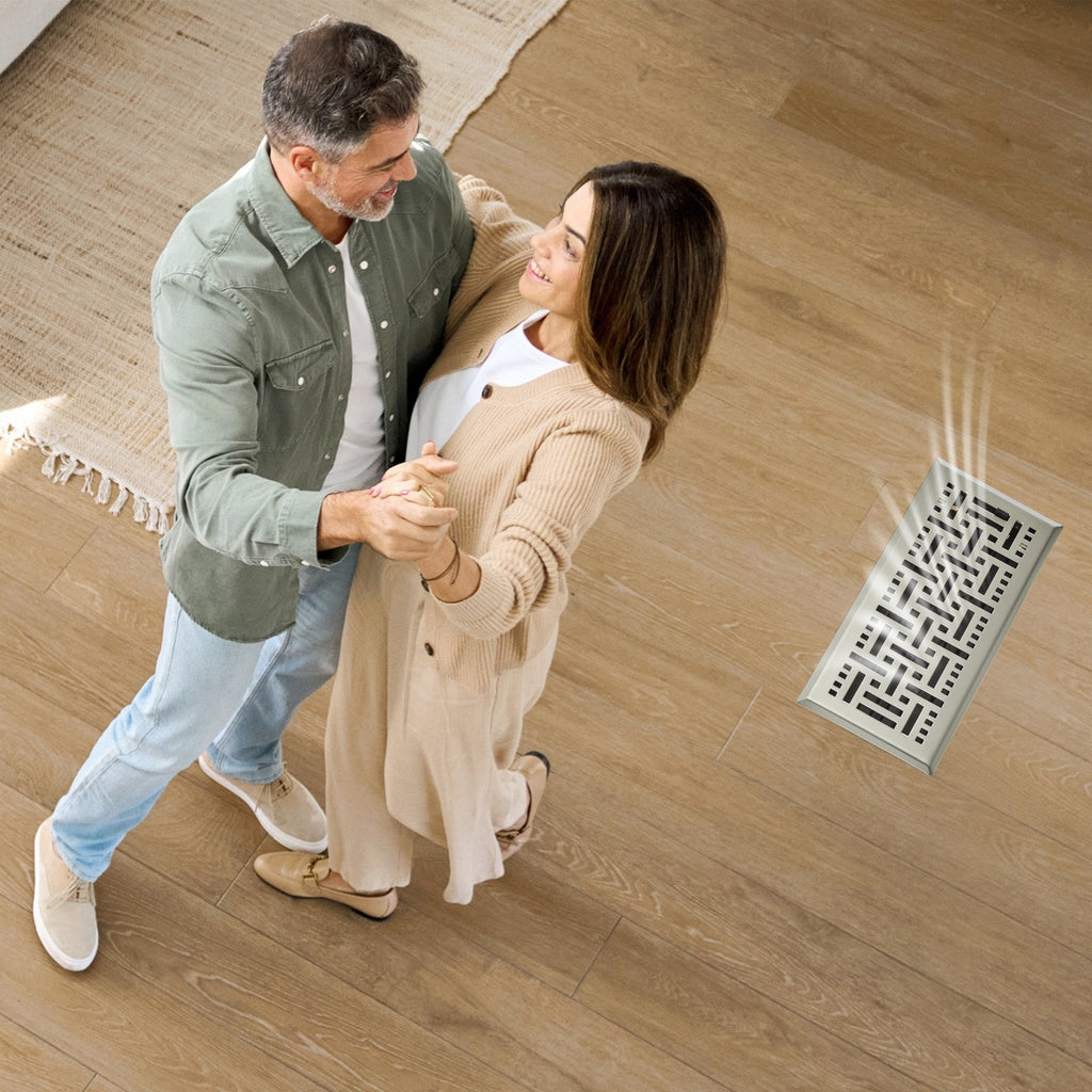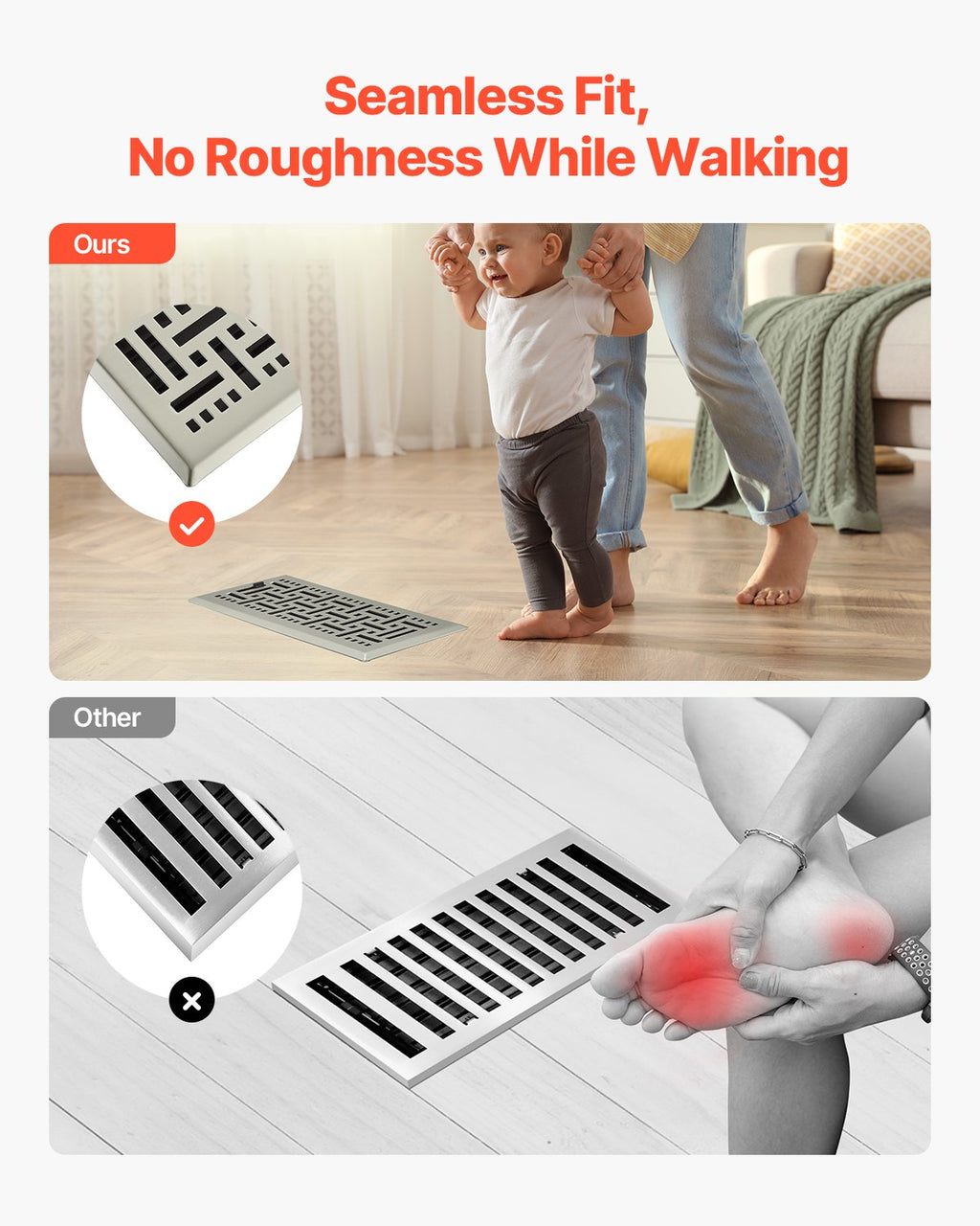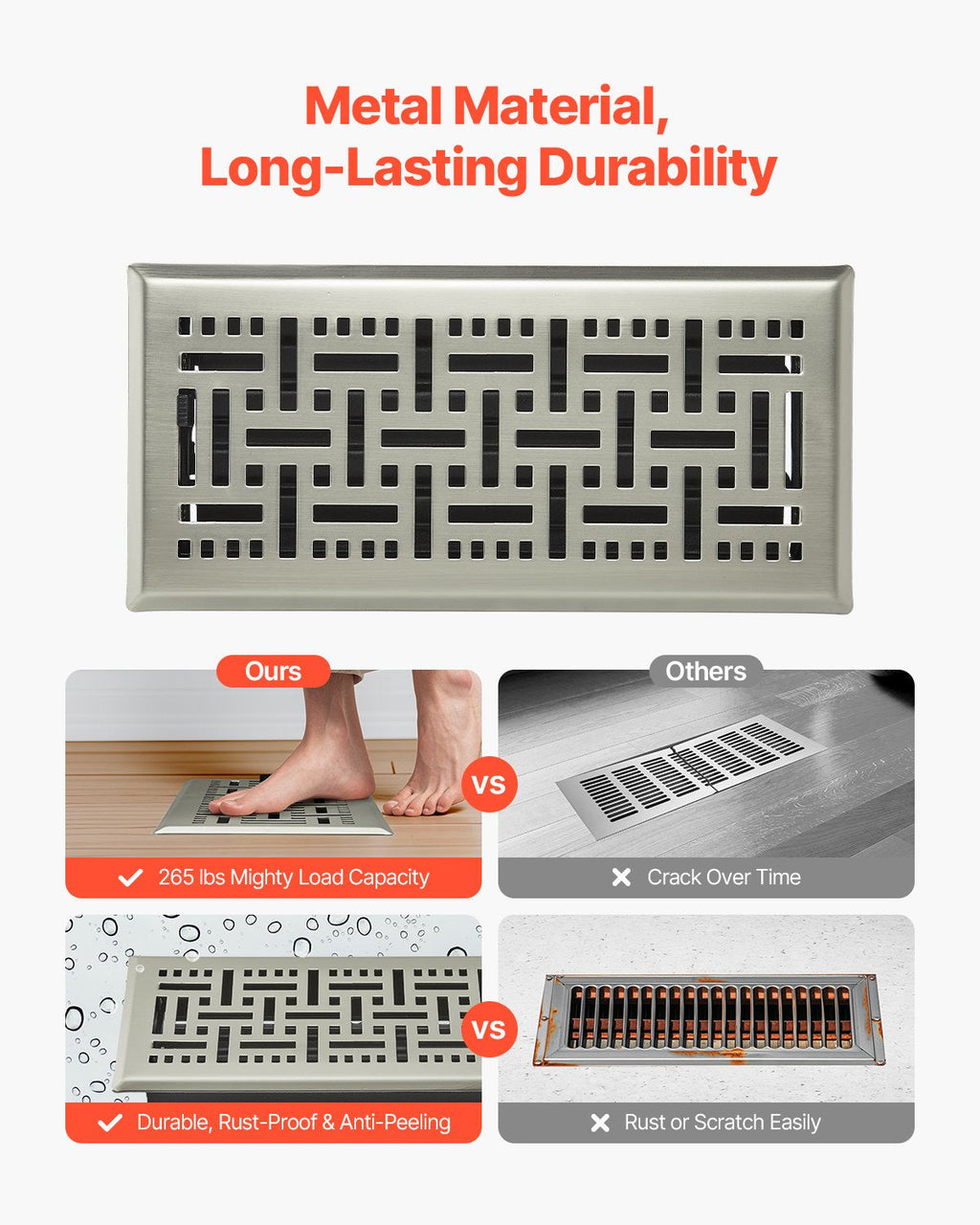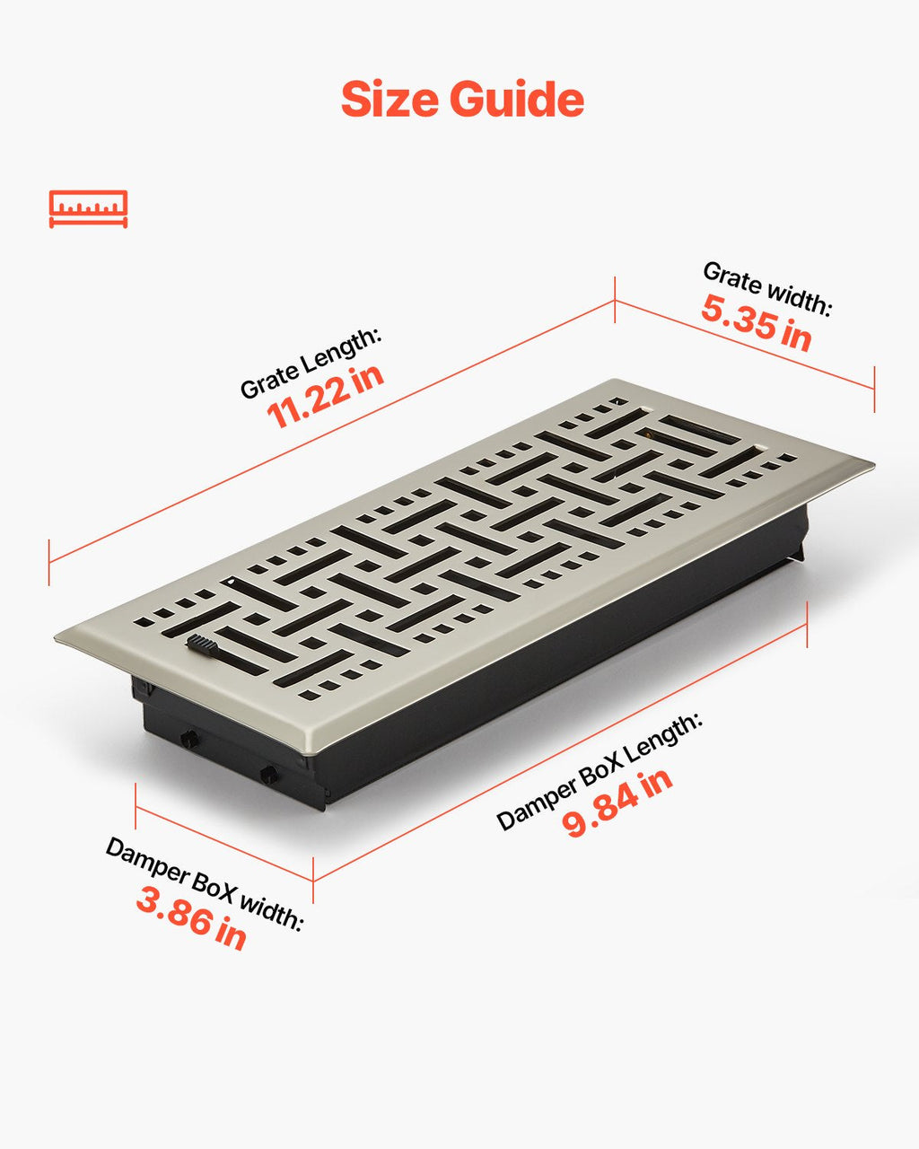 The VEVOR 4x10 Inch Floor Registers combine durability and design to elevate any room's air vent system. This 2-pack of iron floor vents features a sleek nickel-plated dark silver finish with a black interior, perfectly balancing form and function. Designed for standard 10 x 4 in duct openings, each register supports up to 265 lbs, making it ideal for high-traffic areas. Adjustable louvers allow for customizable airflow control, while the easy drop-in design ensures quick installation.
