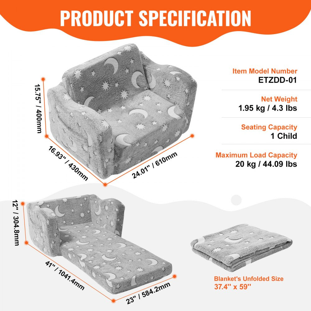 The VEVOR Fold-out Kids Sofa is a versatile 2-in-1 convertible couch designed for toddlers to sit, lounge, and sleep comfortably. Crafted with premium 25D sponge and soft fleece fabric, it features glow-in-the-dark material that adds fun and safety in dim environments. Lightweight and child-friendly, this extra-soft sofa folds out easily to create a cozy lounger perfect for bedrooms and playrooms. With thoughtful design and safe materials, it’s an ideal all-in-one seating and sleeping solution for young children.