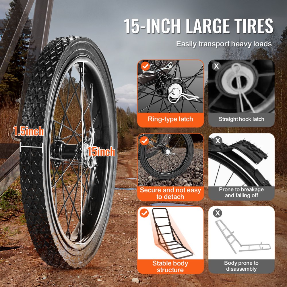 High Load-Bearing Tires: Equipped with large, 15-inch tires, this cart provides excellent stability and traction, even on rough and uneven terrain.