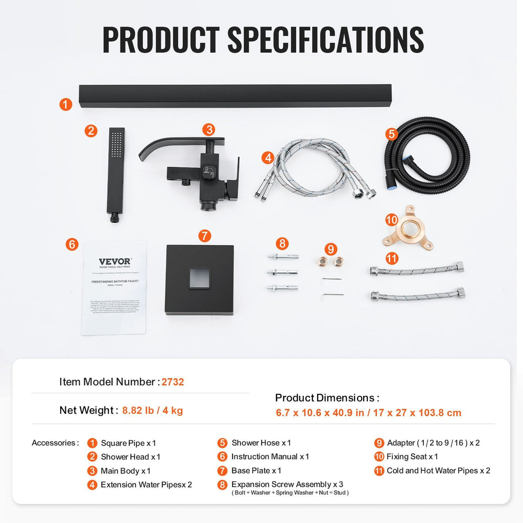 Elevate your bathroom with the VEVOR Freestanding Bathtub Faucet—an all-in-one solution that combines modern design with versatile functionality. Designed for floor mounting, this tub filler features a 360° swivel spout, a handheld showerhead, and two water modes to meet your bathing, pet washing, and cleaning needs. Built with durable materials and rich in accessories, it delivers high flow and long-lasting performance.