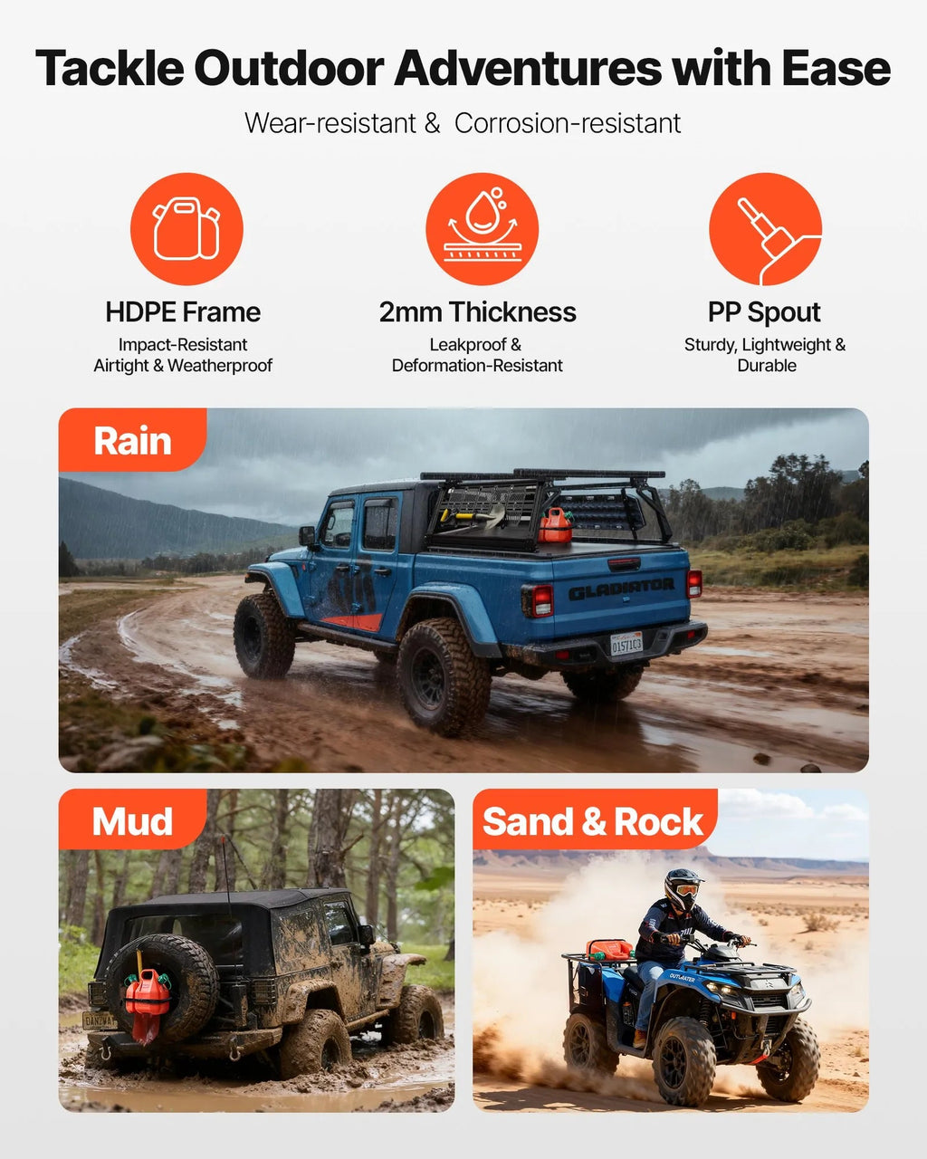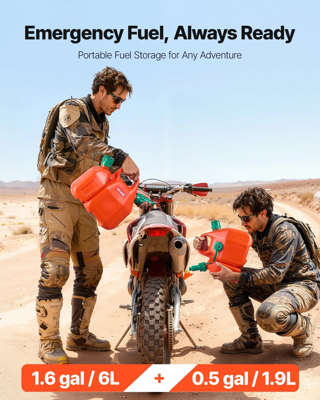 Carry fuel safely and conveniently with the VEVOR 1.6 Gallon Fuel Container with 0.5 Gallon Extra Oil Tank. Compact yet durable, it’s perfect for motorcycles, ATVs, UTVs, cars, and outdoor adventures.