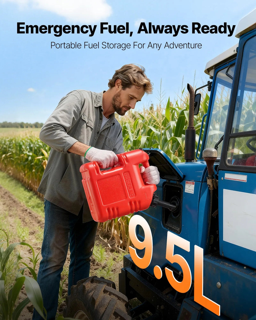 Compact & Portable: 9.5L (2.5-gallon) gas can measuring 11 x 7.7 x 12.8 in, fits easily in trunks or tight spaces for trips, camping, or outdoor work.