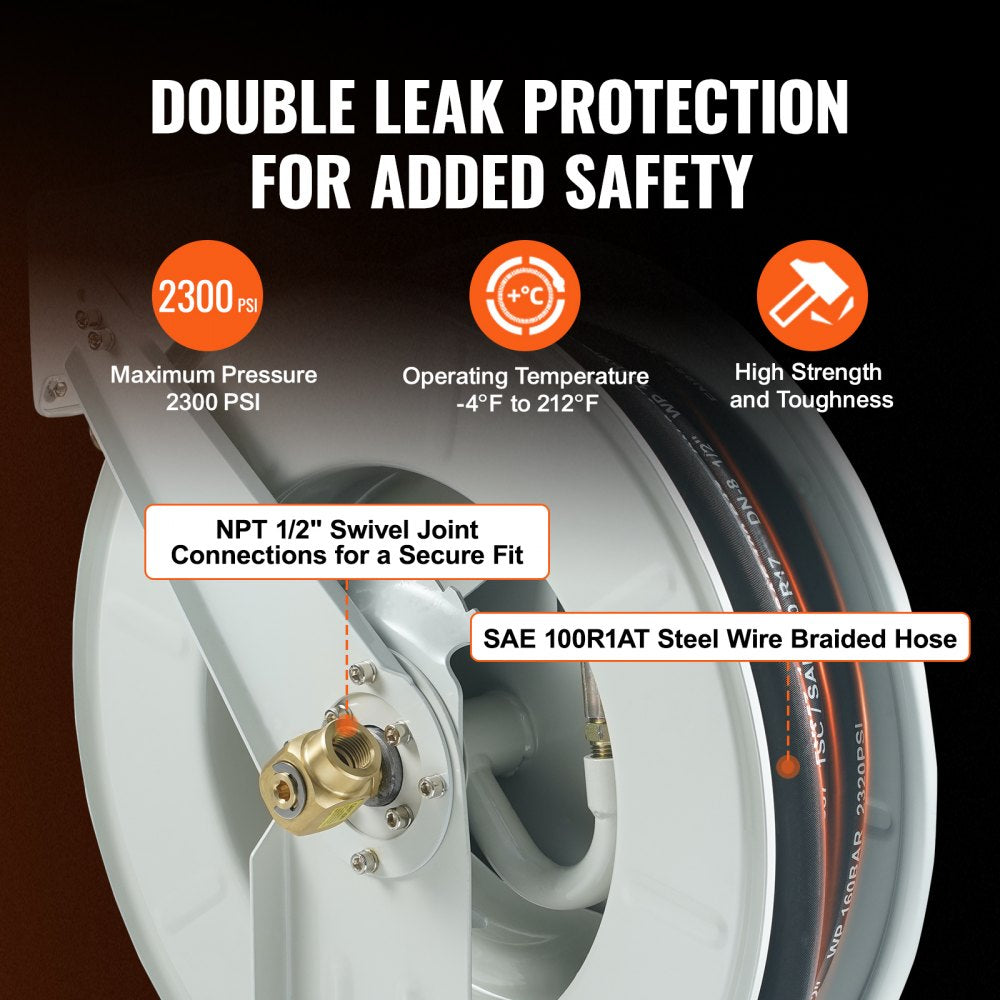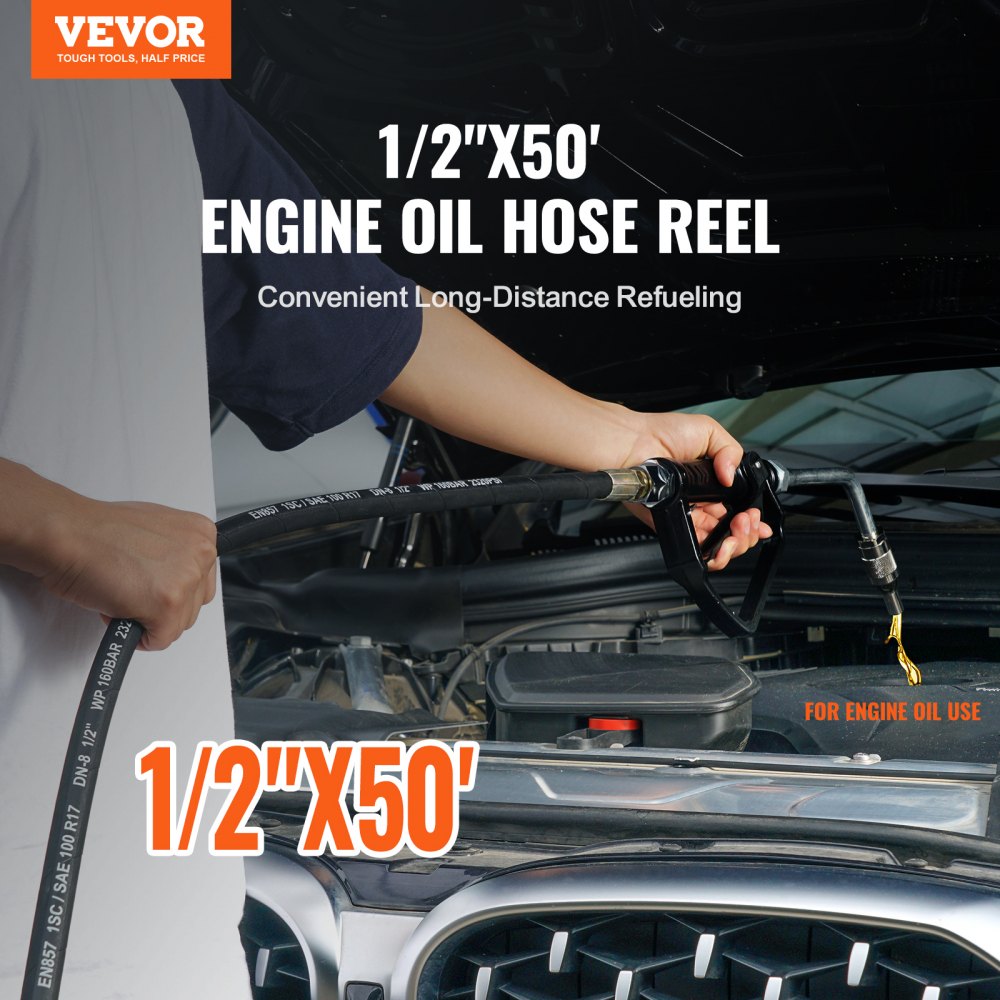 The VEVOR Fuel Hose Reel is engineered for durability and convenience in industrial and automotive settings. Featuring a heavy-duty carbon steel construction, this retractable hose reel holds a 50-foot, 1/2-inch hose designed for smooth, reliable fuel and machine oil transfer. The spring-driven auto swivel rewind system ensures effortless hose retrieval, improving workflow efficiency. With universal thread fittings and ready-to-go mounting slots, installation is quick and adaptable. Built to withstand high pressure up to 2300 PSI and operating temperatures from -4°F to 212°F (-20°C to 100°C), it’s ideal for demanding fuel dispensing and maintenance tasks.