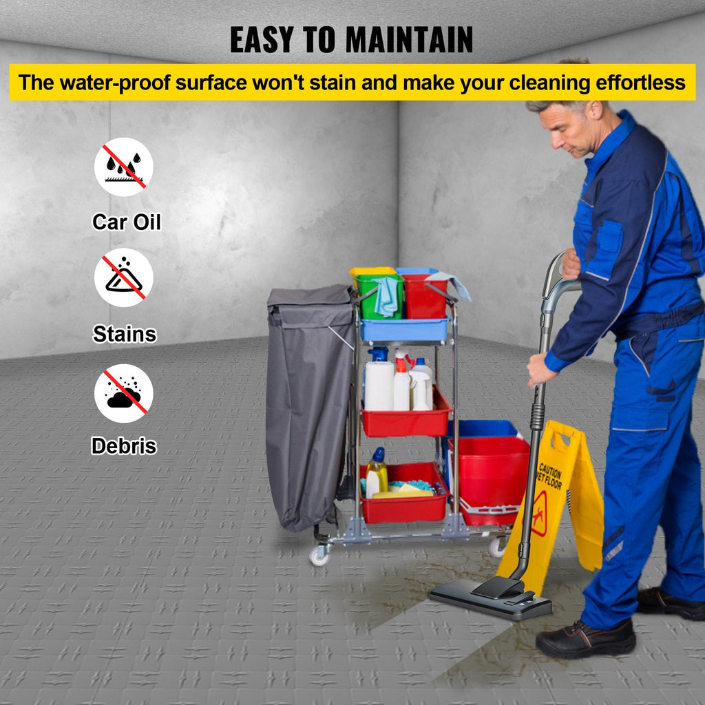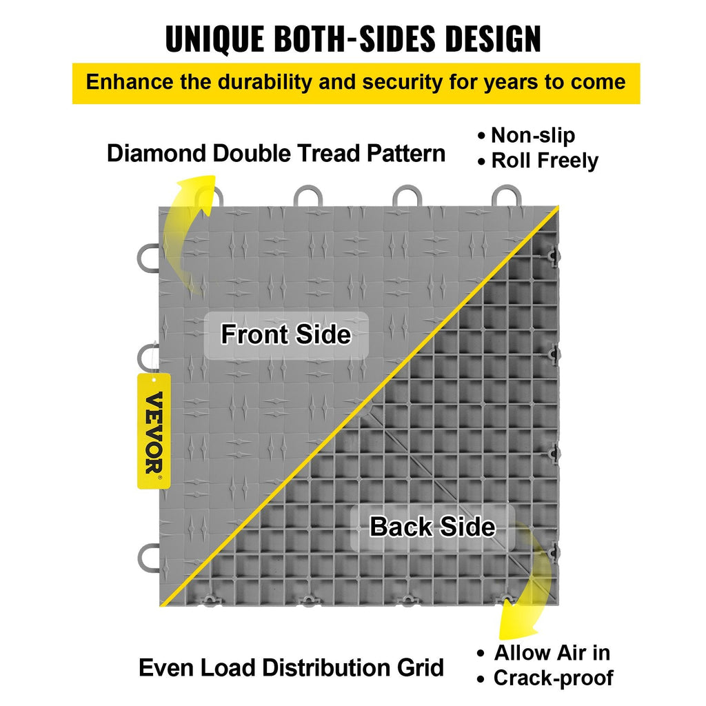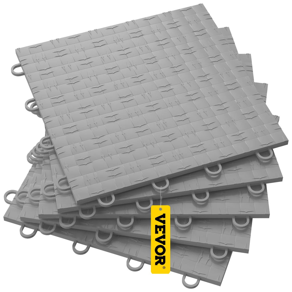 The VEVOR Garage Tiles provide a durable and stylish flooring solution for garages and workspaces. Each tile measures 12 x 12 inches, and the pack includes 25 interlocking tiles finished in sleek silver. These tiles are designed for easy installation and long-lasting performance, offering a slip-resistant surface that enhances safety and aesthetics. Perfect for covering large areas, the interlocking design creates a seamless, professional look suitable for both residential and commercial use.