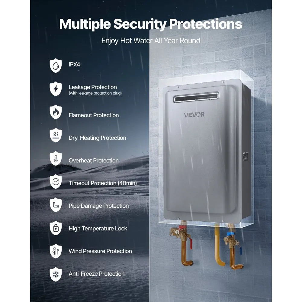 VEVOR Gas Tankless Water Heater 8Gal 191000 BTU Smart Temp Control is a high-quality, durable solution designed to deliver continuous and efficient hot water for large households. Equipped with smart temperature control, this tankless water heater ensures precise and stable operation while conserving energy. Its corrosion- and scale-resistant design provides long-lasting performance, even under low water pressure conditions. Ideal for whole-house use, it provides reliable hot water for showers, sinks, and appliances without the wait.
