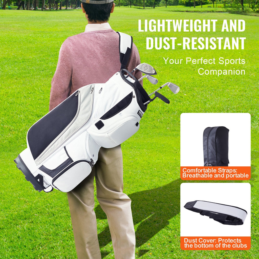Stay organized and stylish on the course with the VEVOR Golf Cart Bag. Designed with a 14-way organizer divider top, this premium nylon cart bag ensures all your clubs are neatly arranged for quick access. With 13 spacious pockets, including zippered compartments for tees, balls, valuables, and more, you’ll have everything you need within reach. The durable nylon material is both waterproof and built to last, while the comfortable, detachable straps and fabric handles offer easy portability. A dust cover is included to protect your bag when not in use. Ideal for both men and women, this golf bag combines practicality with sleek design.