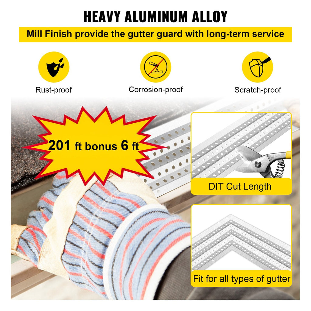 Protect your gutters and reduce home maintenance with the VEVOR Gutter Guards. This set includes 69 packs of durable 5" x 3' aluminum gutter covers, providing a total of 207 feet of reliable coverage. Crafted from mill finish aluminum, these gutter guards resist rust and withstand the elements for long-lasting performance. Designed for easy DIY installation, they can be trimmed to fit gutters on wood, metal, or shingle roofs. By effectively blocking leaves, debris, and pests, these guards help prevent clogs and water damage, saving you time and costly repairs.
