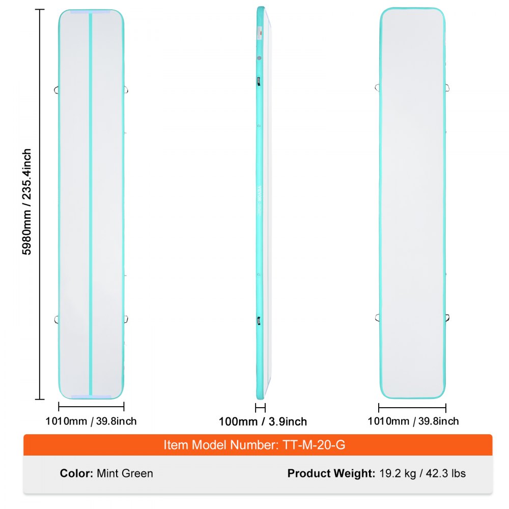Push your training further with the VEVOR 20 ft Inflatable Gymnastics Air Mat—crafted for athletes, dancers, gymnasts, and fitness enthusiasts. With a generous 4-inch thickness and durable construction, this mint green tumble track delivers excellent shock absorption and support for safe landings. Whether at home, in the gym, or outdoors, this mat offers versatile use for gymnastics, cheerleading, yoga, and more. The included electric pump ensures quick setup and takedown, while the compact foldable design allows for easy storage. It’s a reliable, high-performance mat with thoughtful details for every skill level.