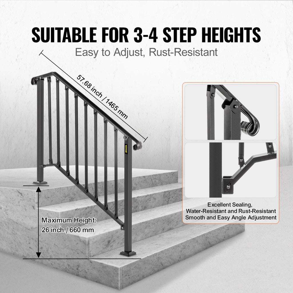 Enhance the safety and style of your outdoor staircase with the VEVOR Handrails for Outdoor Steps. Designed to fit 3 or 4 steps, this handrail features the elegant Picket#3 design crafted from durable wrought iron. The sleek black finish adds a modern touch that complements various exterior styles. Its flexible design adapts easily to both concrete and wooden steps, making it a versatile addition to any home. Ideal for combining aesthetic appeal with practical safety, this handrail provides a secure grip while elevating the look of your porch or staircase.
