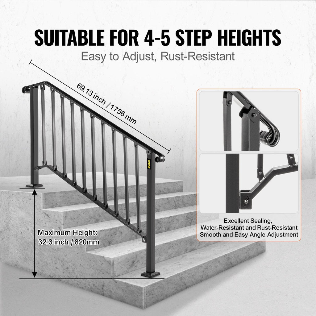 Enhance safety and style with the VEVOR Handrails for Outdoor Steps. Designed to fit 4 or 5 steps, this sturdy outdoor stair railing is crafted from durable wrought iron, combining elegance with strength. The classic picket#4 design and sleek black finish add timeless charm, complementing any exterior décor. This flexible porch railing is suitable for installation on both concrete steps and wooden stairs, making it a versatile choice for a variety of outdoor settings. Perfect for transitional spaces, it provides reliable support while enhancing the aesthetic of your outdoor staircase.