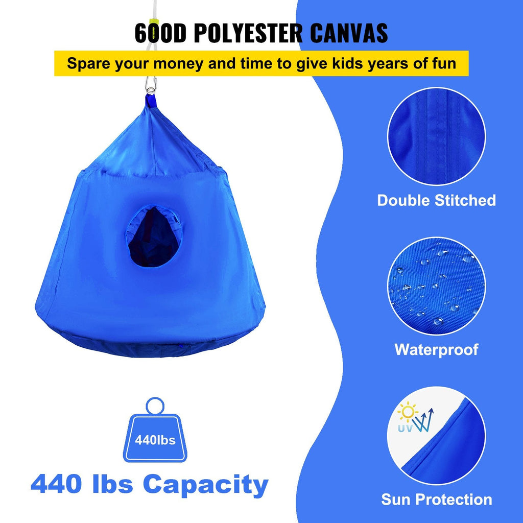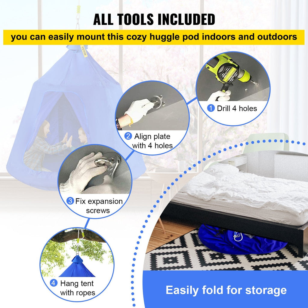 Experience elevated comfort and fun with the VEVOR Hanging Tree Tent. Designed for both kids and adults, this versatile hanging tent supports up to 440 lbs and features an inflatable cushion for extra coziness. Vibrant LED rainbow lights add a magical glow, making it perfect for reading, relaxing, or playtime. Whether hung indoors as a ceiling hammock or outside from a sturdy tree, it’s a stylish and functional retreat in a striking blue color.