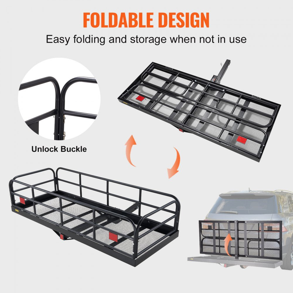 Maximize your vehicle's cargo space with the VEVOR Folding Hitch Cargo Carrier. Built from high-strength Q235B steel with a corrosion-resistant powder-coated finish, this 60"x24"x14" hitch-mounted basket offers 10 ft² of extra storage and supports up to 400 lbs of gear. Whether you're hauling luggage, camping supplies, or tools, the foldable design and included stabilizer ensure smooth, wobble-free transport. Compatible with standard 2" receivers, it's perfect for SUVs, trucks, and pickups.