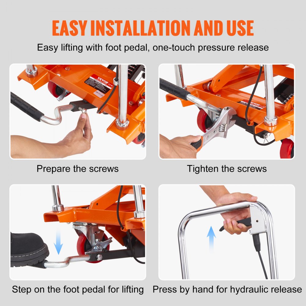 Boost your material handling efficiency with the VEVOR Hydraulic Lift Table Cart. This rugged cart features a 500 lbs load capacity and a smooth manual single scissor hydraulic lift, raising loads up to 28.5 inches for easy access and transport. Built with durable Q235 cold-rolled steel and coated for long-lasting use, it includes lockable swivel wheels for stability and maneuverability, plus a non-slip pad to secure items during lifting. Ideal for warehouses, workshops, and industrial settings.