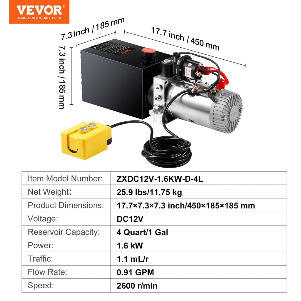 Power your dump trailers and car lifting operations with the VEVOR 4 Quart Hydraulic Pump. Designed for single-acting applications, this 12V hydraulic power unit delivers a reliable 0.91 GPM flow rate and a robust 3200 PSI maximum pressure. Built with durable GC01-grade steel, this compact yet powerful pump ensures smooth, controlled performance for heavy-duty tasks.