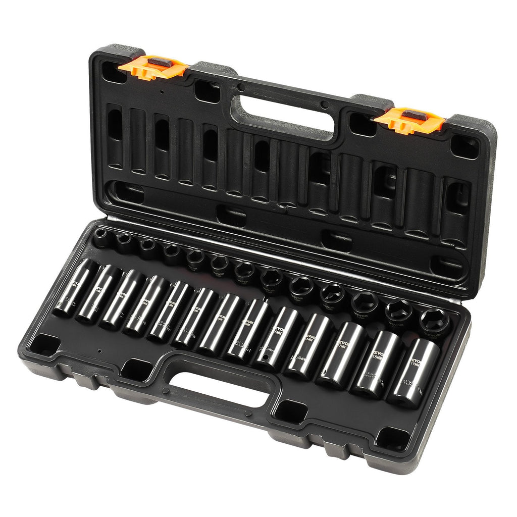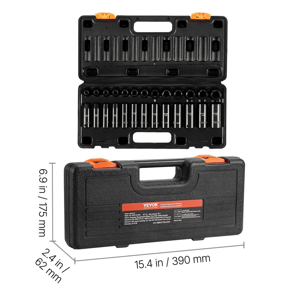 Tackle demanding tasks with confidence using the VEVOR 3/8-Inch Impact Socket Set. This 26-piece set includes both deep and standard metric sockets, ranging from 7mm to 19mm, giving you the versatility needed for a wide range of automotive and industrial applications. Designed with a 6-point configuration, each socket offers a firm grip that minimizes fastener rounding. Made from premium Cr-V (chrome vanadium) steel, these impact-rated sockets deliver outstanding durability and strength under high torque conditions. The included storage cage ensures quick organization and transport.