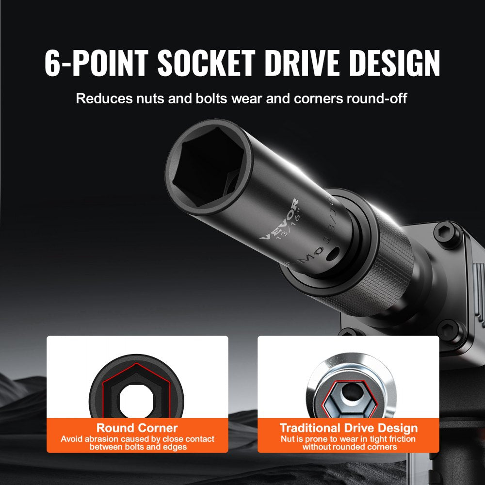 The VEVOR 25-piece Impact Sockets Set is designed for durability and high performance. Made from high-quality CR-MO alloy steel, these sockets can withstand high torque, making them perfect for heavy-duty applications. The 6-point design ensures a secure grip, while the distinct size markings provide quick identification. The set is housed in a rugged carrying case for convenient storage and transport, keeping everything organized and ready for use.