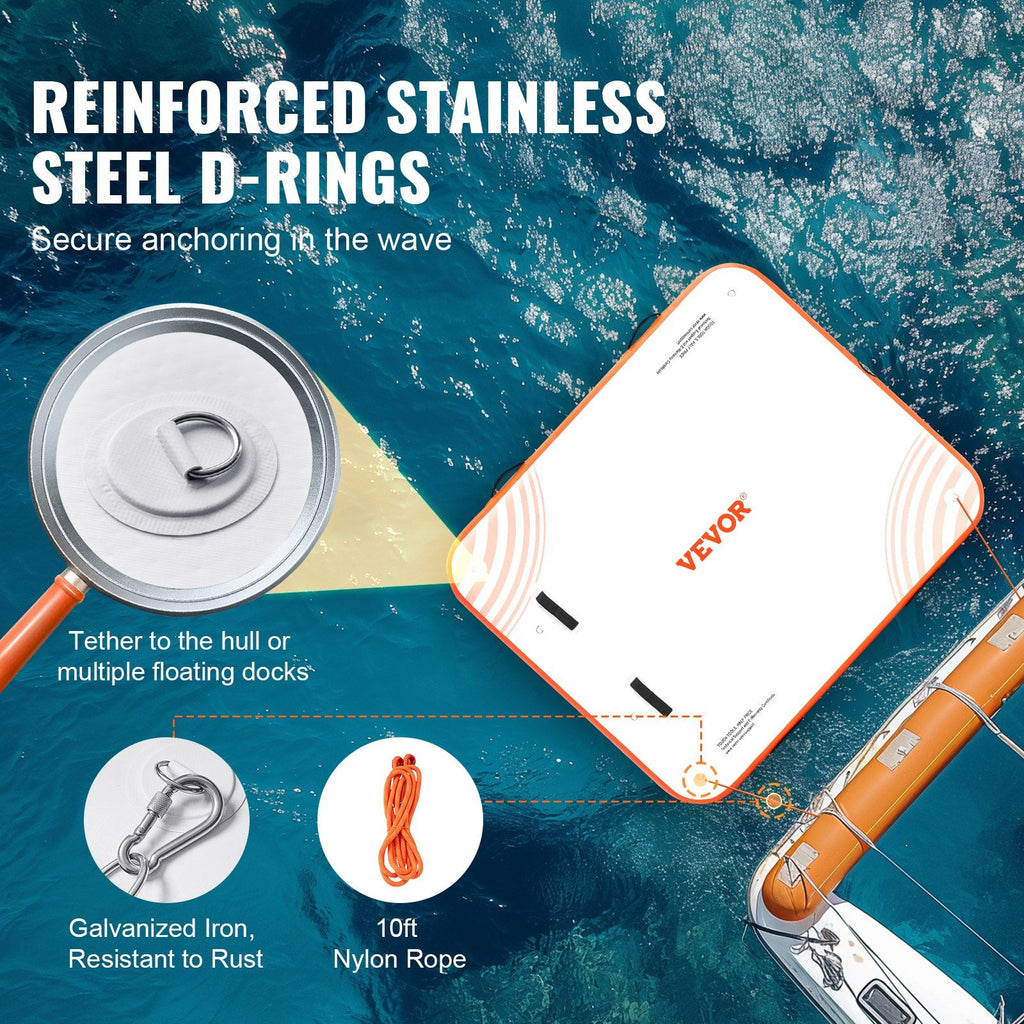 Turn any body of water into your personal island with the VEVOR 6 x 5 FT Inflatable Floating Dock. Crafted from premium PVC brushed non-slip fabric, this floating platform provides a safe, stable surface for relaxing, sunbathing, swimming, or playing on the water. It features a detachable four-step soft ladder, dual-action manual pump for quick inflation, and stainless steel D-rings for secure anchoring. Lightweight and portable with a carrying bag included, it’s the perfect companion for pool parties, lake outings, or ocean adventures.