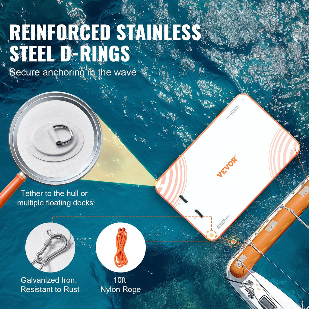 The VEVOR Inflatable Floating Dock is a versatile and fun water accessory designed for maximum enjoyment. Whether you're at the pool, beach, or the open ocean, this 8 x 5 ft non-slip floating platform offers a safe and comfortable space for relaxation, play, or water activities. Crafted from durable PVC brushed non-slip fabric, this floating dock ensures stability while in use. The dock includes a detachable four-step soft ladder for easy access and comes with a portable carrying bag for convenient storage and transport. Setting up the dock is a breeze with the dual-action manual pump, and the secure anchoring system keeps it steady on the water.