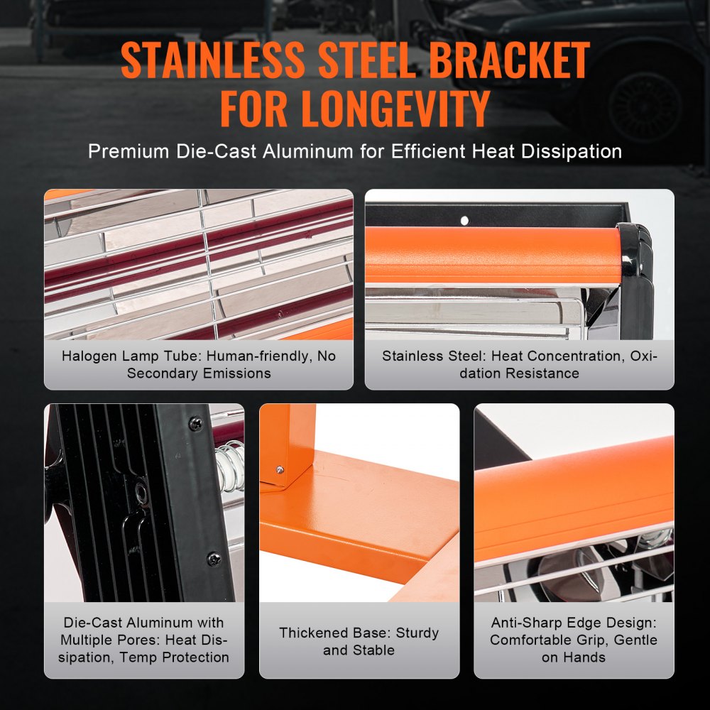 The VEVOR Infrared Curing Lamp is a powerful, versatile tool designed to provide efficient drying and curing for automotive repairs, paint booths, and engine drying. With 3300W of power and an adjustable timer function (1-60 minutes), this curing light offers precise control over your drying process. It features strong penetration ability to speed up drying times and improve finish quality. The lamp comes with a height and angle adjustable bracket, ensuring optimal positioning for different repair tasks. Made from high-quality stainless steel, aluminum, and carbon steel, it’s built for durability and long-lasting use in various professional environments.