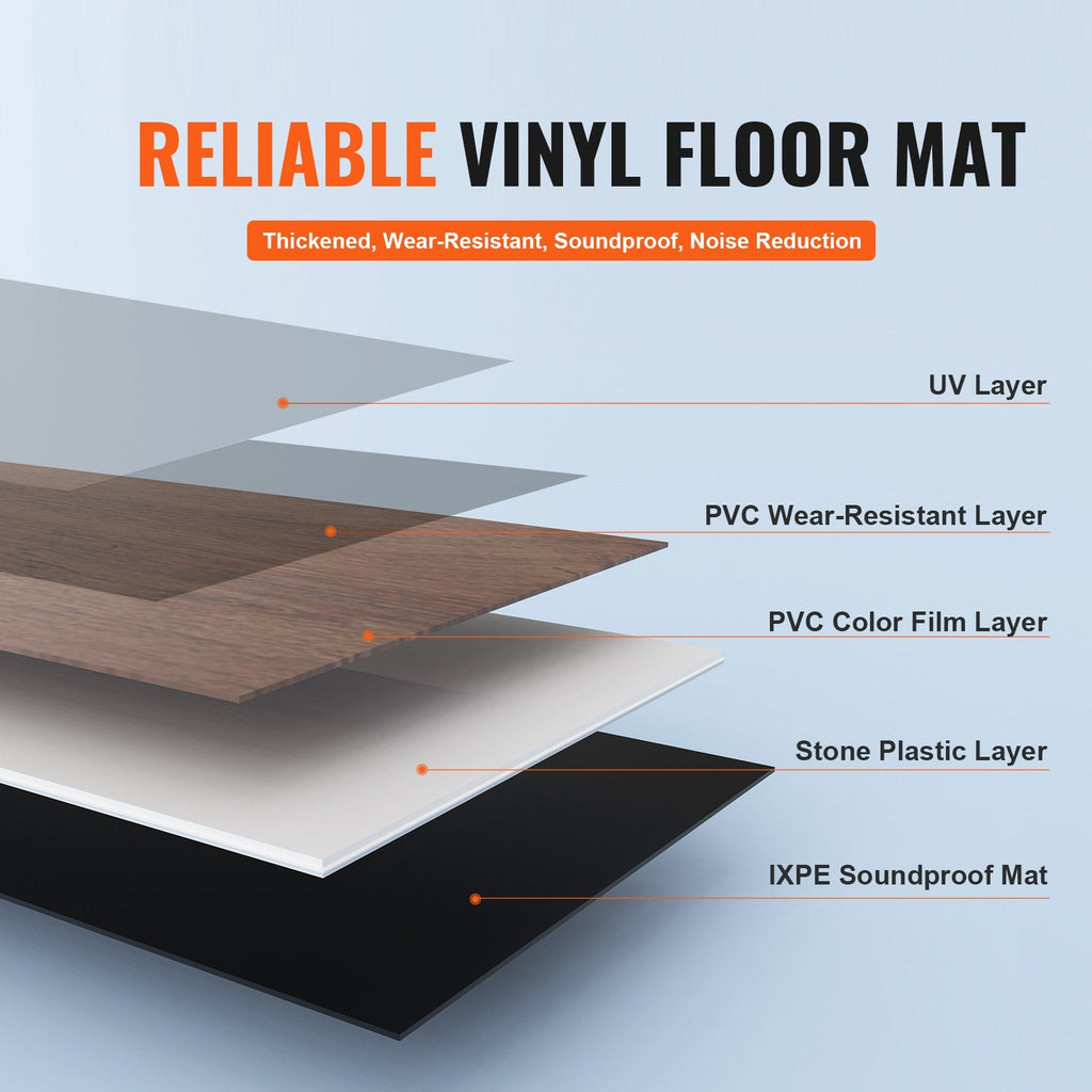 Elevate your space with VEVOR’s Interlocking Vinyl Floor Tiles, designed for beauty, durability, and simplicity. These luxury vinyl tiles feature a rich deep brown wood grain finish and interlocking edges for effortless installation. With a robust 5.5mm thickness, including a soundproof underlayment, these tiles offer exceptional comfort, wear resistance, and acoustic insulation. Perfect for residential or commercial settings, they are easy to clean and maintain, making them ideal for living rooms, kitchens, offices, and more.
