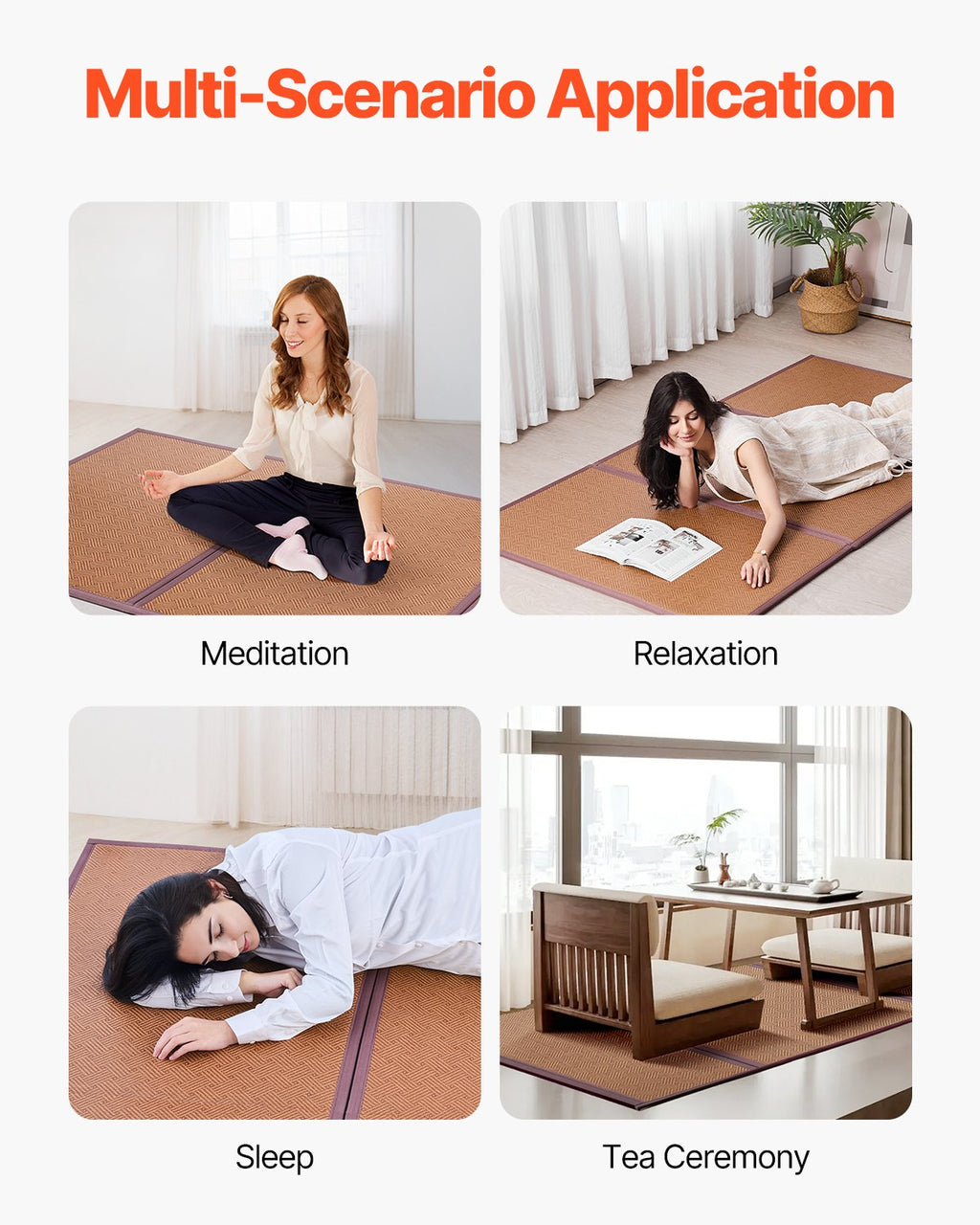 Embrace traditional Japanese comfort with the VEVOR Foldable Tatami Mat, crafted from natural rattan for a breathable, durable, and stylish surface. Measuring 80 x 39 inches, this mat is ideal for sleeping, meditation, or multipurpose floor use. The non-slip backing keeps it stable on various surfaces, while the three-fold design makes it easy to store and carry. Perfect for small spaces, this mat offers natural temperature regulation and effortless maintenance for a refreshing, low-maintenance lifestyle.