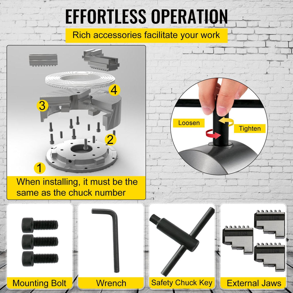 Upgrade your machining with the VEVOR K11-100 4" Lathe Chuck. Featuring a self-centering 3-jaw design, this chuck ensures precise and reliable clamping of your workpieces. It includes two sets of jaws for versatile use across various applications. Perfect for metal lathes, grinding, and milling machines, the K11-100 delivers durable construction and accurate performance. Ideal for professionals and hobbyists seeking dependable machining tools.